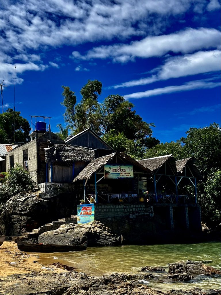 Da kommt auch schon ein Einheimischer und offeriert uns sein Lokal, das „Gargote la terrasse chez Ursulla“. Ob wir bei ihm etwas zu Essen bekämen, unsere Frage? Es sitzt nämlich niemand auf Ursullas Terasse. Oui, oui… Ahhh, Ursulla liegt auf der Treppe und der Rest der Mannschaft auch…