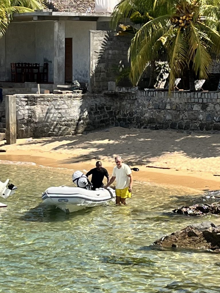 Dann bestellen wir erstmal was zu trinken. Klaus Coca Cola, hier World Cola genannt und ich das heimische Bier. Da gibt’s Gelächter. Der Papa die süße Cola, die Mama das herbe Bier… 😂. Aber erstens ist das nicht herb und zweitens wird die Flasche am Tisch geöffnet. Beim letzten Wasser war ich mir da nicht so sicher… und den flotten Otto habe ich just in die Schranken weisen können. Ich mach’s halt wie im Mittelalter, besser Bier als verunreinigtes Wasser, hicks 🍺. Ich will doch mal wissen, was „Gargote“ eigentlich heißt? Hahaha, billige Kneipe, mieses Restaurant… , na das ist ja wohl ein Name…! Hoffentlich steht der nicht fürs Programm!!! 🫢 Klaus bestellt Zebu Rind mit Pommes und ich Poisson et Légumes / Fisch und Gemüse. In der Zwischenzeit frage ich, ob wir das Dinghy dort sicher zurücklassen können, wenn wir nachher noch ein paar Schritte ins Dorf machen möchten? Ja, ja, aber besser, wir holen es etwas näher ans Lokal. Okay… Der gute Mann und Klaus machen sich an die Arbeit, ich darf sitzen bleiben.