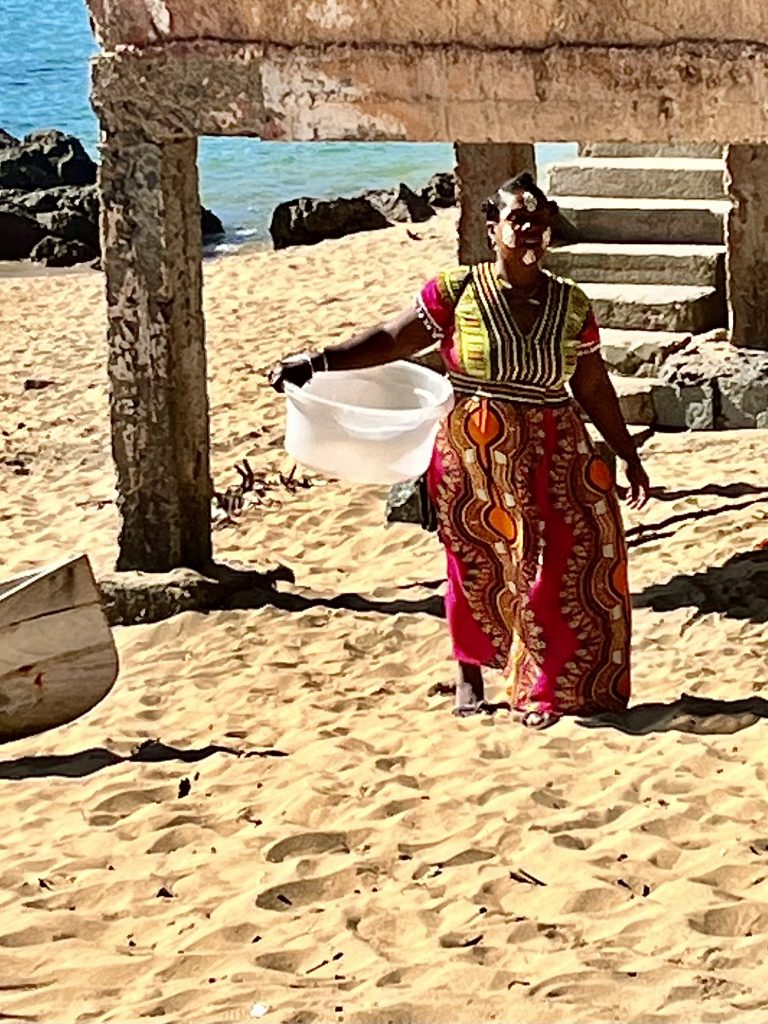 Eben mal zwischen zwei Hütten hindurch, und schon steht man am Strand und wird vom Glitzern des Meeres in den Bann gezogen. Da kommt uns eine Frau entgegen, mit auffälliger Gesichtsbemalung.