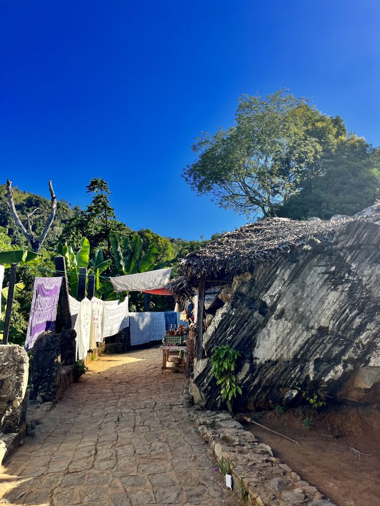 Jetzt geht’s aber erst richtig zur Sache. Ein gepflasterter Weg führt uns vorbei an dutzenden Souvenirhütten. Alles gepflegt, kein Müll und ein Rausch der Farben.