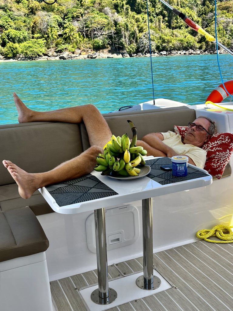 Dann kommen wir wohl schon nahe an den Park heran, denn ein Mann ruft uns hinterher, dass wir für den Park Eintritt bezahlen müssten, unten am Ticket Häuschen. Alles klar! Klaus möchte jetzt eh zurück. Seine Füße tun weh, ist er doch barfuß unterwegs, die Ferse schmerzt, immer noch eine Verletzung vom intensiven Paddel Match auf den Seychellen mit unseren Kindern, und er macht sich Sorgen um Dinghy und Yuti. Also, ich wäre ja zu gerne noch in den Park zu den Lemuren gegangen, aber das muss ich mir wohl für heute verkneifen… 😌. Wir laufen zurück und siehe da, das Dinghy und Yuti sind noch an Ort und Stelle. Der Mann vom Restaurant hilft uns noch das Dinghy ins Wasser zu bugsieren, und dann geht’s zurück zum Boot.