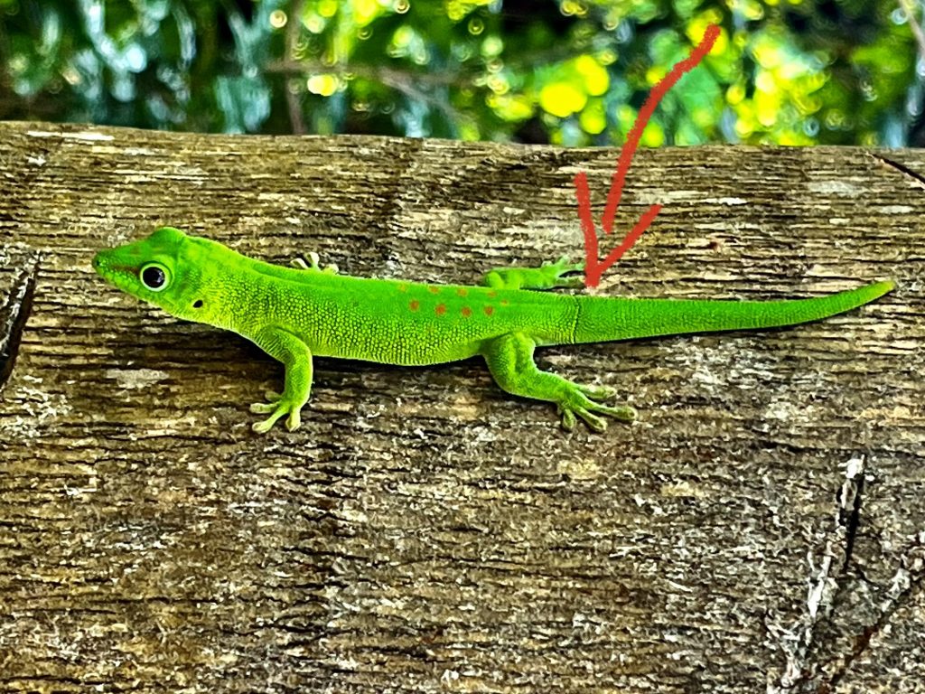 Toll ist hier die Sollbruchstelle am Schwanz zu erkennen. Sollte er, ja es ist ein er mit den roten Punkten am Rücken, am Schwanz gepackt werden, wirft er ihn einfach ab. Der Jäger ist zufrieden, der Gecko auch, wächst ihm doch ein neuer Schwanz nach. Wenn auch ein etwas kleinerer…