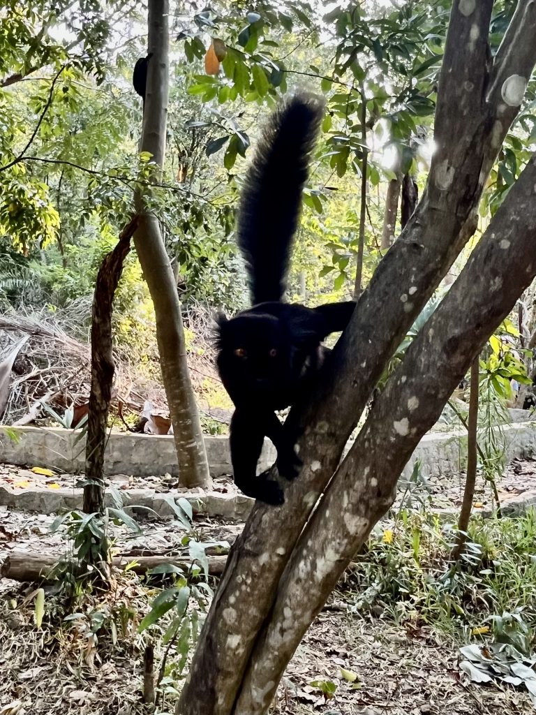 Und dann sind sie da. Über uns, neben uns, auf uns, die seltenen Schwarzlemuren. Die Männchen sind schwarz wie die Nacht, die Weibchen braun. Sie gehören zu den Feuchtnasen Primaten und leben ausschließlich auf Madagaskar und zwar nicht nur die Schwarzlemuren, sondern alle Lemurenarten.