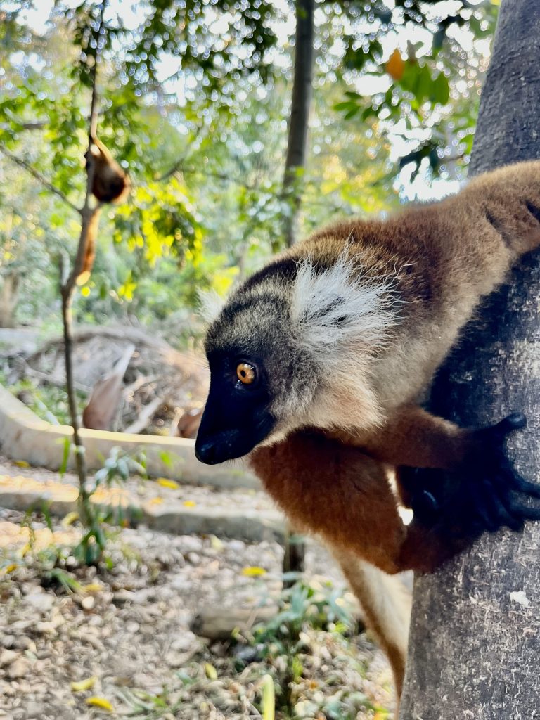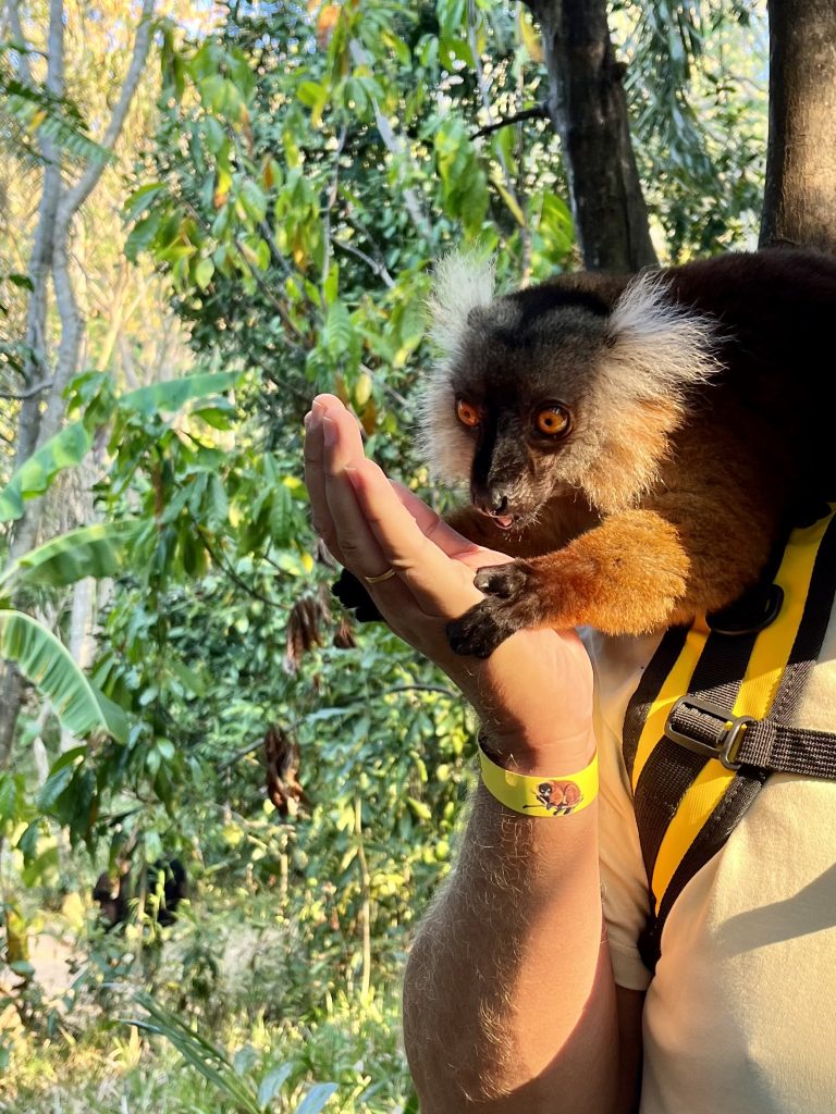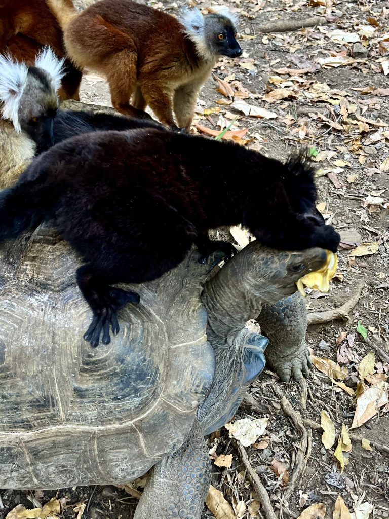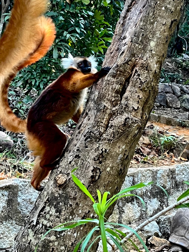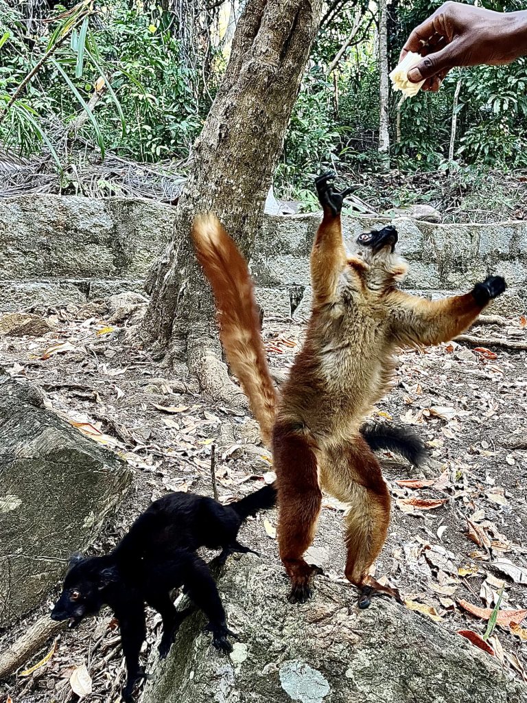 Ja, bis zu 20 Jahre können sie werden, sagt Julien. Das lustige Grunzen heißt wohl, wo ist Banane, gib mir Banane. So beleidigt dreht der Lemurenmann mir dann den Rücken zu, als ich grunze… 🤣
