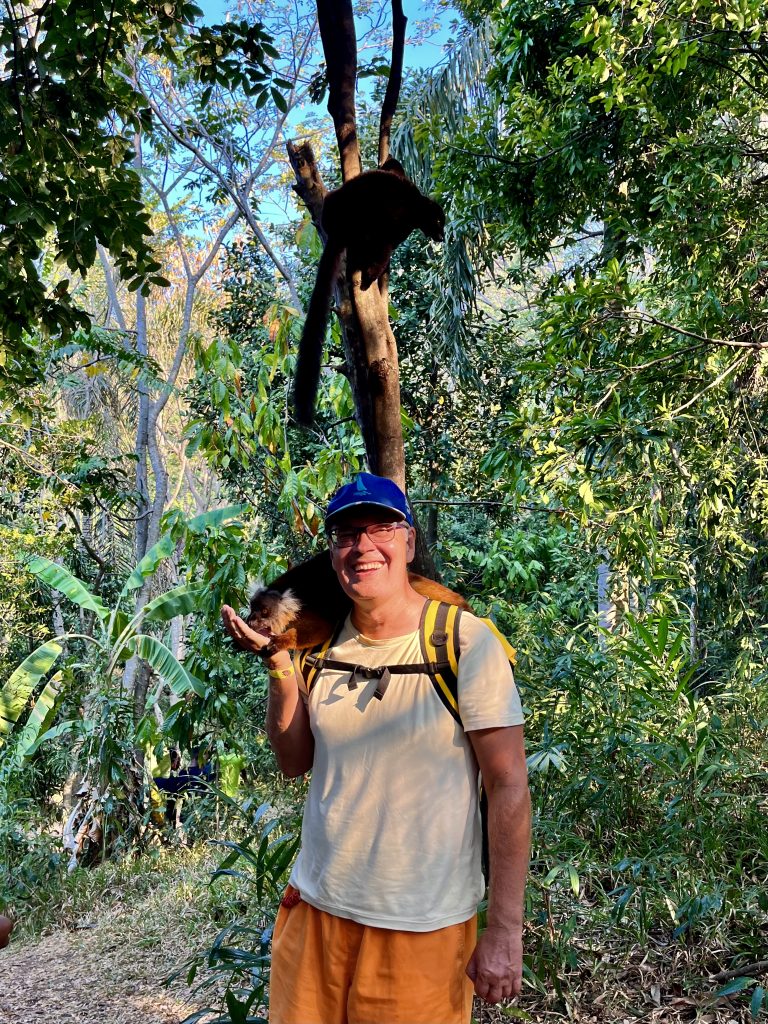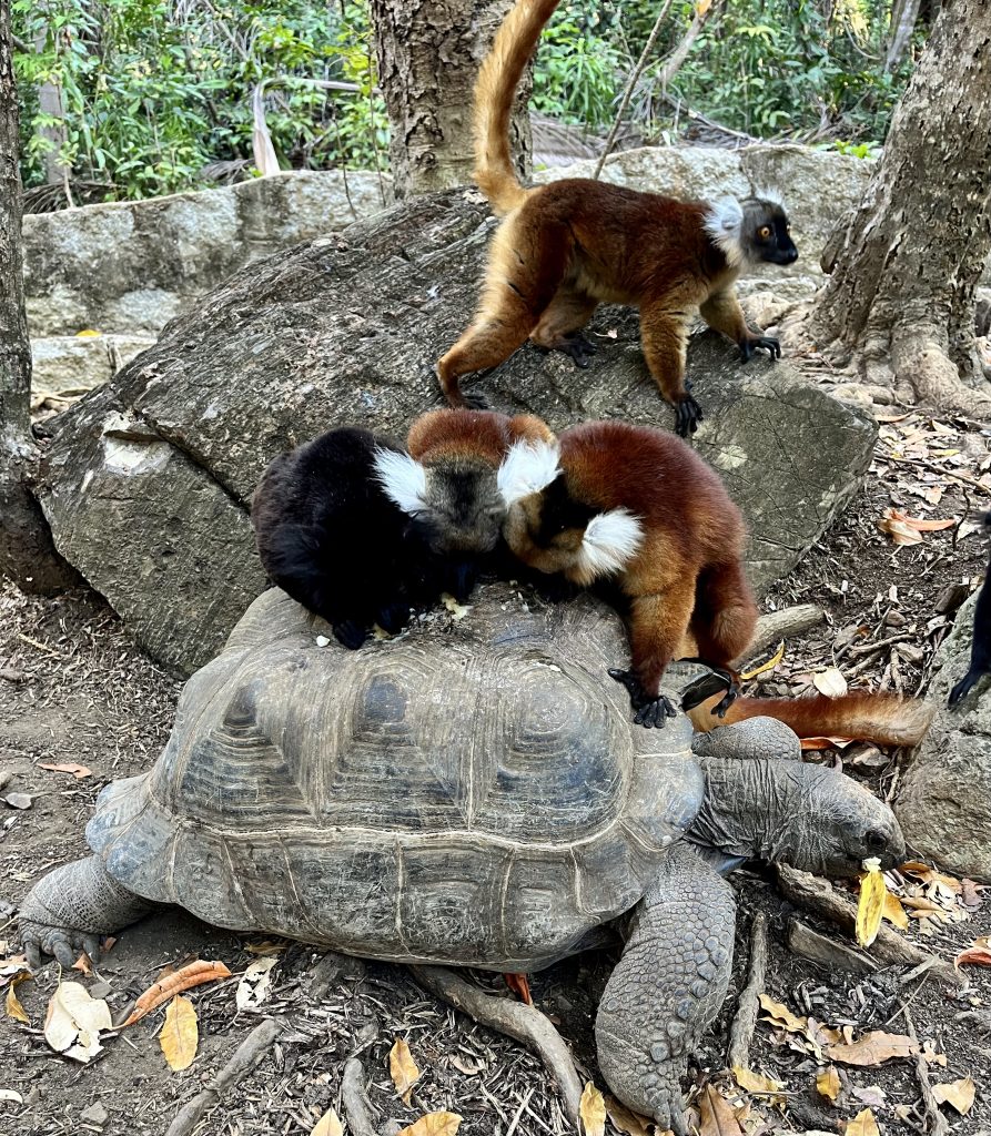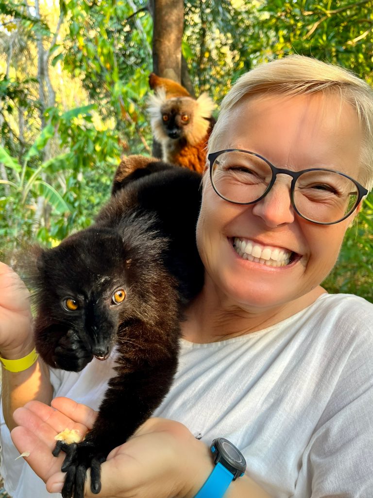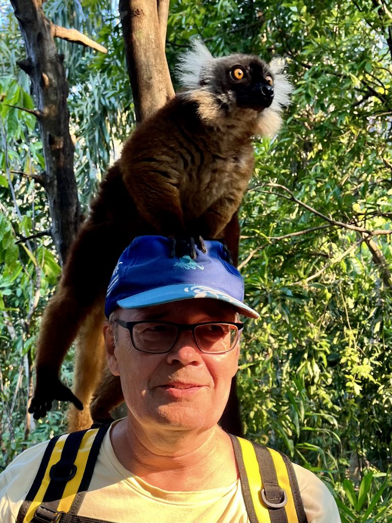 Ja, bis zu 20 Jahre können sie werden, sagt Julien. Das lustige Grunzen heißt wohl, wo ist Banane, gib mir Banane. So beleidigt dreht der Lemurenmann mir dann den Rücken zu, als ich grunze… 🤣