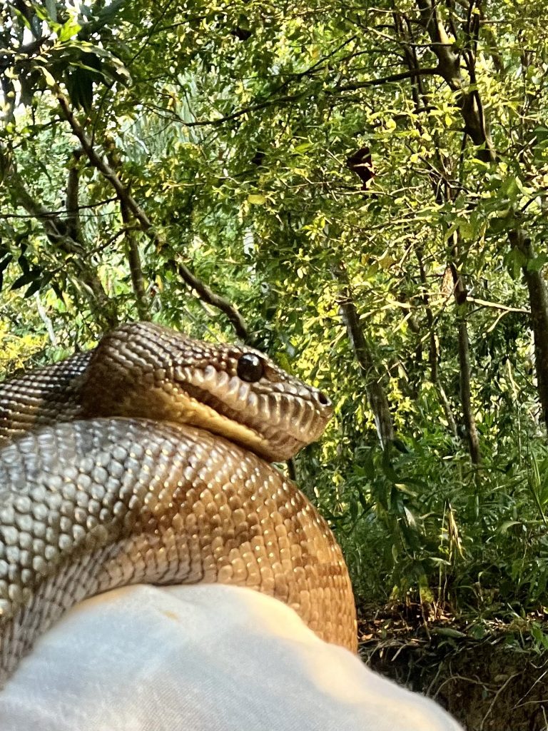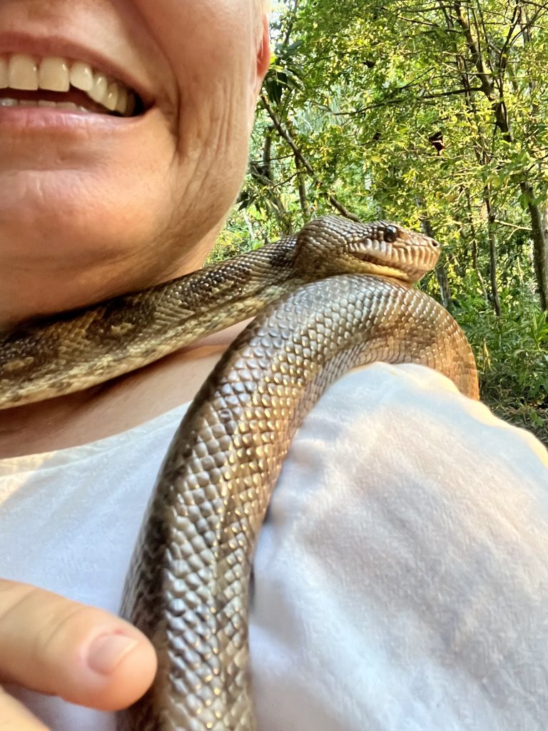Sie ist schön, warm und ledrig glatt. Sie fühlt sich echt gut an. Nur als sie sich um meinen Hals schlängelte, musste ich kurz nachdenken… Nein, eine Würgeschlange ist sie nicht. 😅 Dann ist auch Klaus bereit für die Schlange.