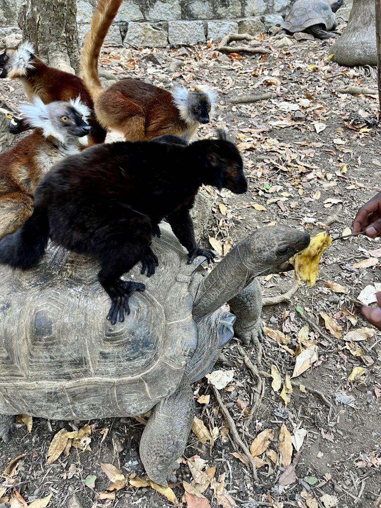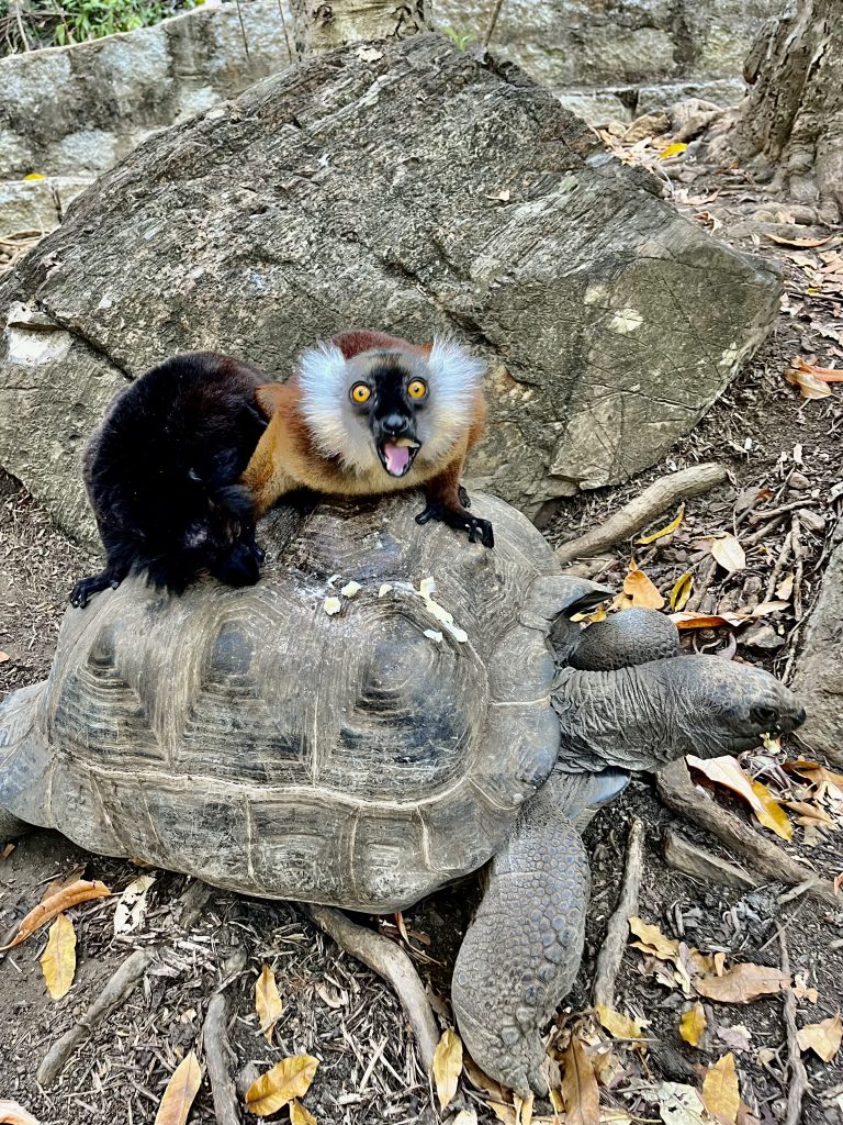 Jetzt zu den Schildkröten. Zu denen hatten wir ja schon auf den Seychellen Dauerkontakt. Diese hier sind bedeutend kleiner und kommen von den Galapagosinseln. Die stehen auch auf Bananen, müssen sich aber bei dieser Lemurenkonkurrenz ranhalten.