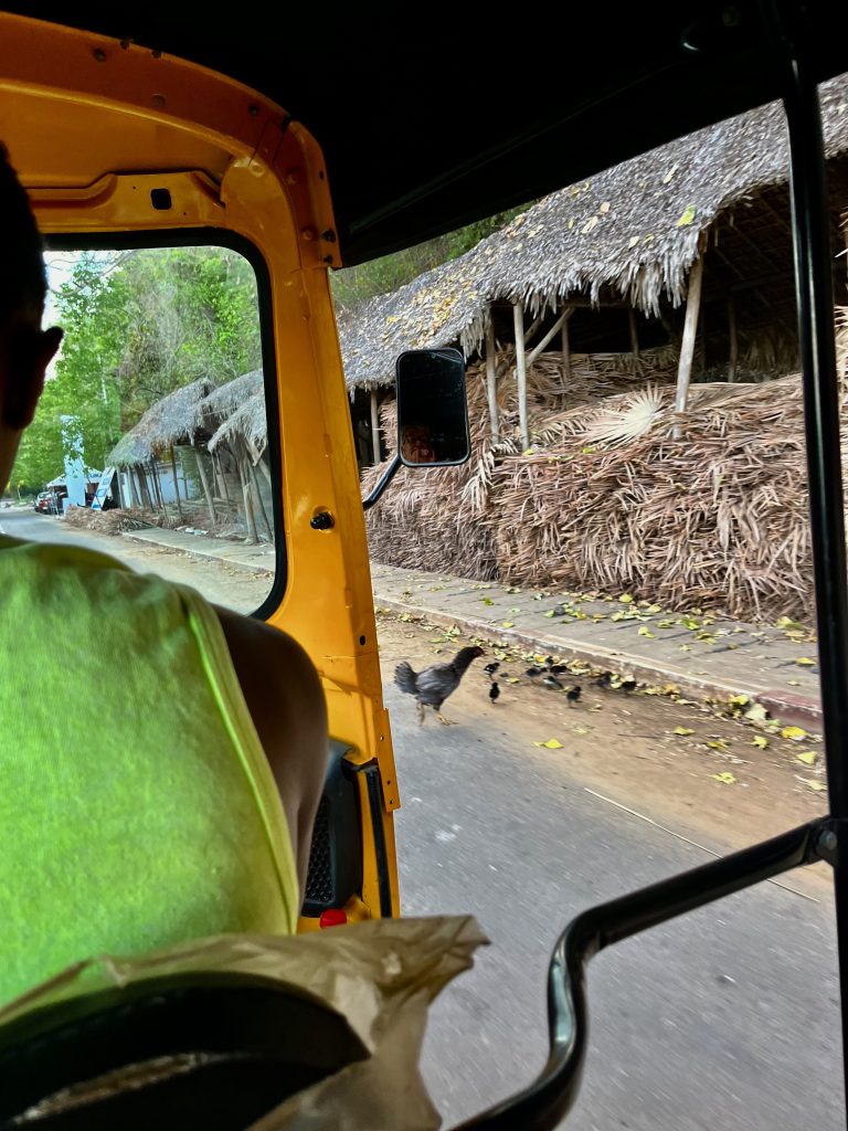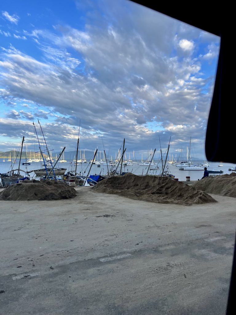 Ja, das Tuktuk ist mit uns wieder schwer bepackt und quält sich ein weiteres Mal zurück zur Marina. Vorbei am Hafen mit seinen Palmenblatt-Lagern und den Baustoff-Sand-Haufen.