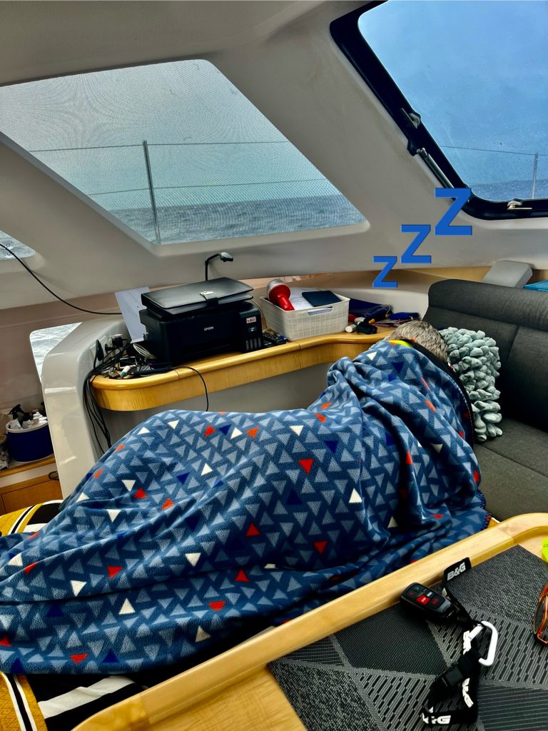 Ja, er schläft gar nicht in dieser Nacht, ich dafür am laufenden Bande. Es ist richtig kalt geworden, der Wind bläst einiges über 20 Knoten. Wind und Strömung sind wieder ganz anders als vorhergesagt – doof.