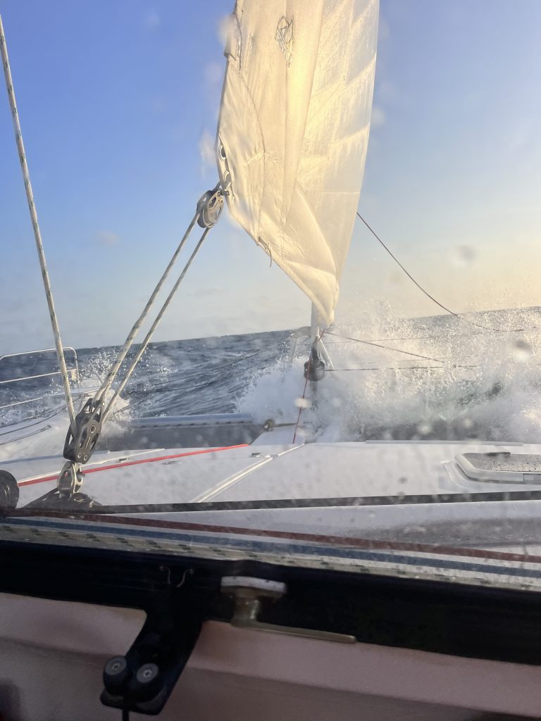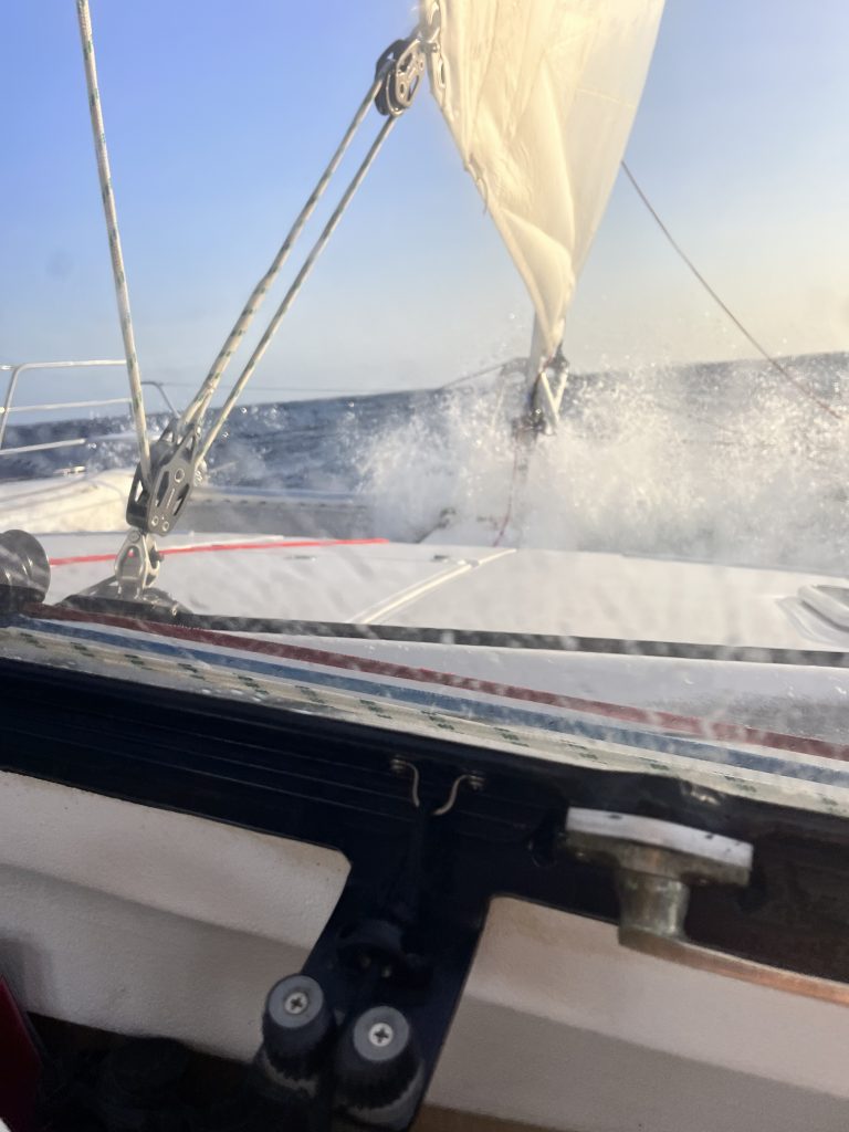 Und wieder dreht der Wind auf Süd, die Wellen bremsen ungemein. Das Jib flattert wieder… – doof.