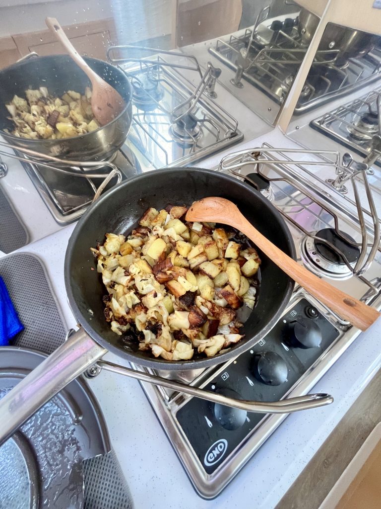 Da will ich heute mit dem Gasherd noch einmal ein schönes Essen fabrizieren. Die letzten Kartoffeln mit Weißkohl werden gebraten und mit Tuna aus der Dose serviert.