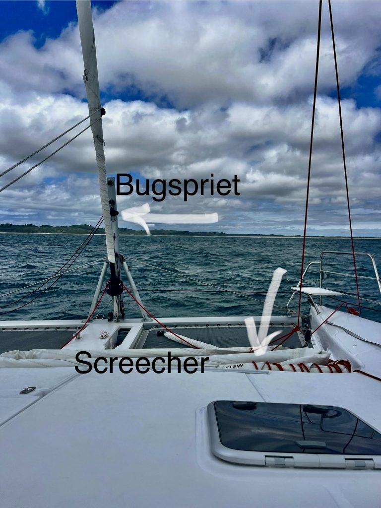 Morgens um 7:00 Uhr zeige ich ihm den Salat und er entscheidet, der Bugspriet muss hochgeklappt, das Screecher dafür heruntergelassen werden. Okay, wird umgehend gemeinsam erledigt.