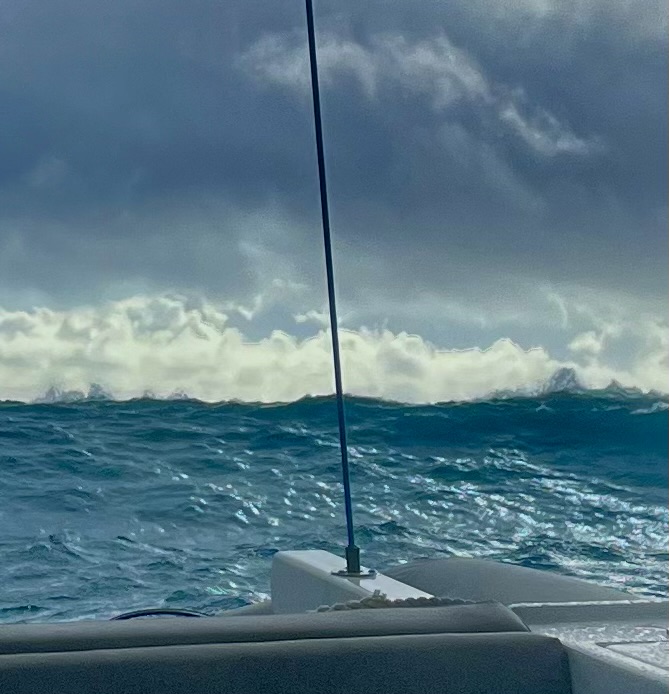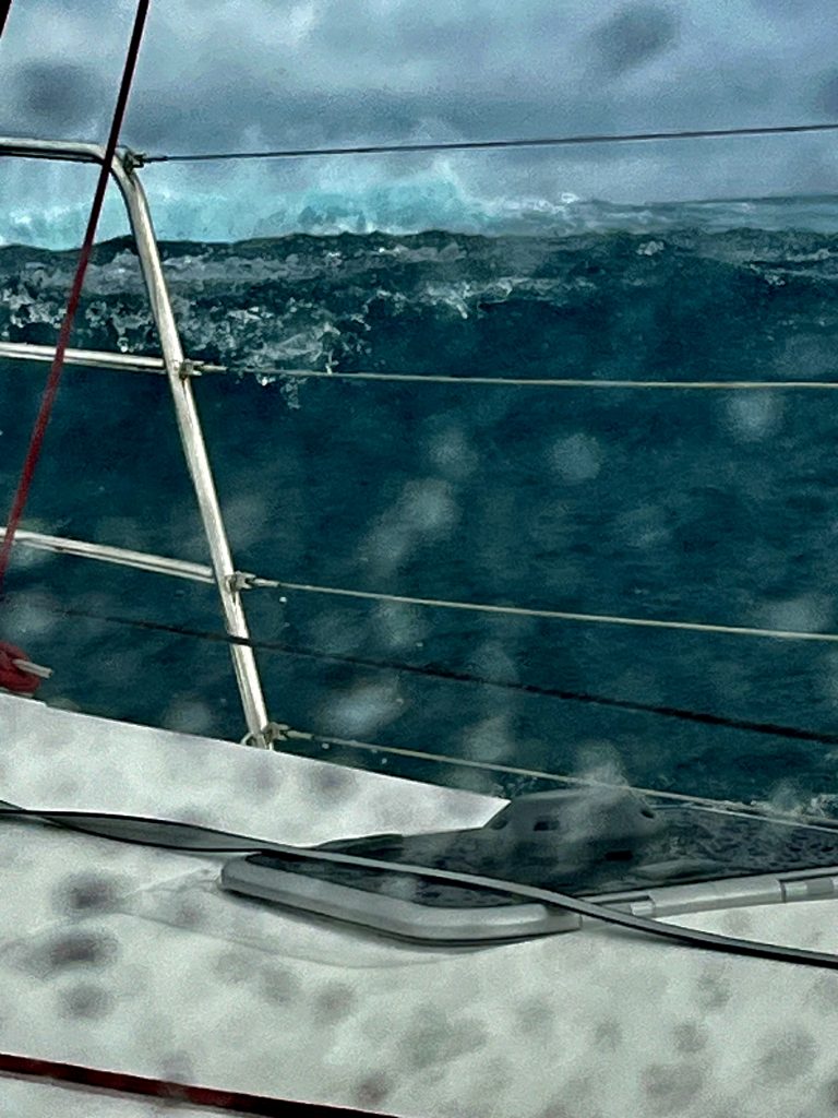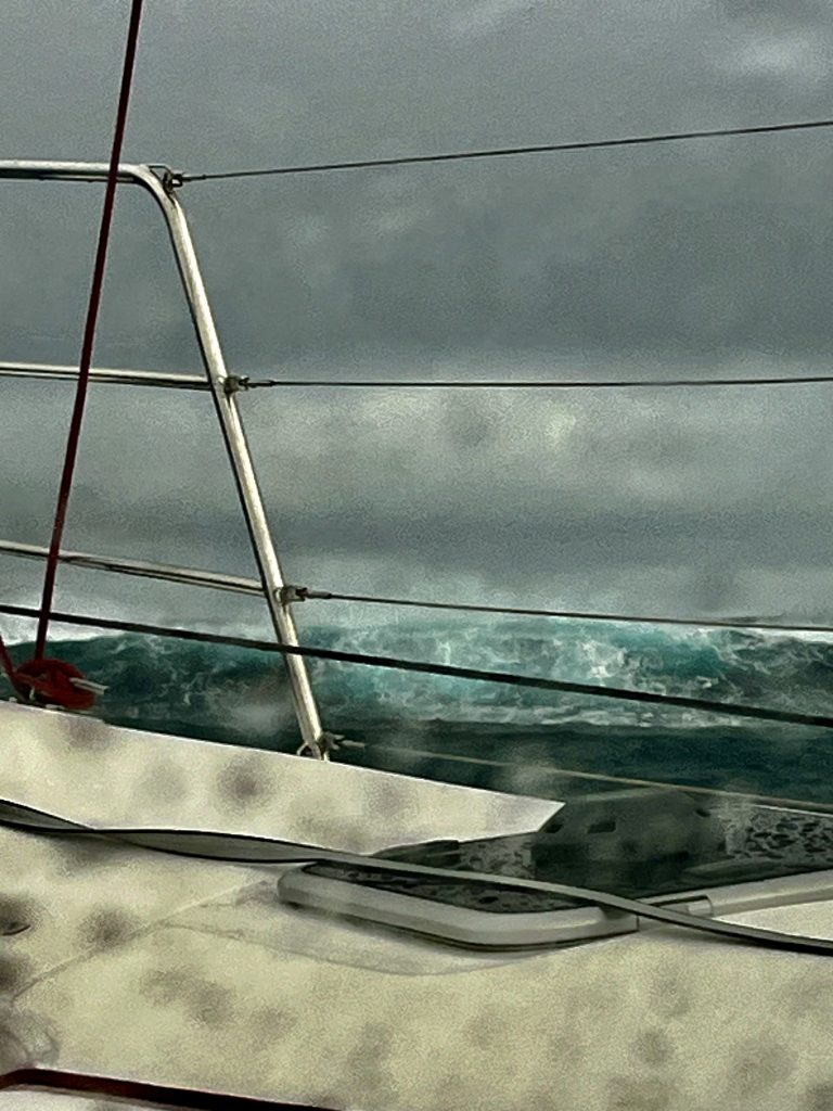 Also, ich habe recht gut geschlafen. 😊 Und Klaus?? Nicht! 😕 Warum? Habe ich wieder den Weltuntergang verschlafen? Nein, eigentlich nicht. Er war unruhig. Ist mir schon klar. Wieder liegt die weitere Routenplanung nur bei ihm. Die Verantwortung drückt gewaltig. Um 6:35 Uhr, ich sitze schon fast auf meiner Toilette, kommt eine Monsterwelle von hinten angerauscht, bricht und schlägt übers Boot. Klaus ruft nur noch, festhalten, und zwei weitere folgen. Es fliegen die Dinge nur so im Boot umher und wir surfen diesmal mit 6 Knoten zum Anker. Wahnsinn, einen Monohull, schräg getroffen, hätte es vielleicht umgeworfen. Wie eine Wand kam die Welle auf unser Boot zu, meint Klaus geschockt. Was machen wir hier? Was ist hier los??