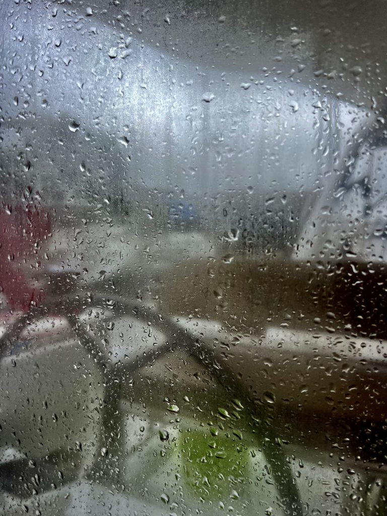 Der ist sooo lang, dass er hinten schon wieder unscharf wird. 🤭 Am Boot muss ALLES wieder gut verstaut werden. Eine schweißtreibende Aufgabe. Dann fängt es an zu gewittern und massig zu regnen. Es läuft natürlich wieder rein ins Boot, wir wissen immer noch nicht wo eigentlich? Aber, die neue Bilgepumpe arbeitet nun gut und zuverlässig.