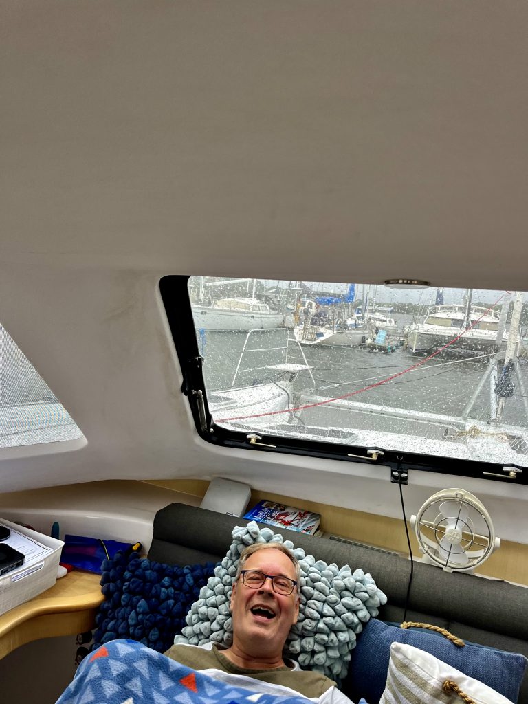 Nächster Tag. Heute regnet es ohne Unterlass, und es stürmt nicht zu knapp. Alles klappert, klickert, ächzt und stöhnt. Natürlich vor allem bei den anderen Booten. 😉 Wir legen heute mal so‘n richtigen Gammeltag ein.