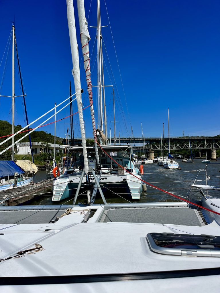 Ein kleiner, sehr kleiner Yacht Club, recht rumpelig aber mit besonders netten Leuten❣️Klaus hatte ja schon regen WhatsApp Kontakt mit Peter im Vorfeld und meint, er hätte ordentlich geschleimt, um einen guten Platz für uns zu bekommen. Hat wohl geklappt. Wir haben nen super Platz! Den letzten am Steg! Wir müssen uns nirgends durchquetschen und können problemlos rückwärts wieder raus. Bryce begrüßt uns herzlich. Der Franzose, der gar kein Franzose ist, sondern ein belgischer Mauritier kommt angesprungen. Er und seine Familie sind mit ihrer Lady Blue ja schon ein paar Stunden hier und mussten sich durch sehr enge Bootsreihen durchquetschen. Millimeter Arbeit❗️Tja, da ist es manchmal ganz gut, als Zweiter anzukommen. 😉