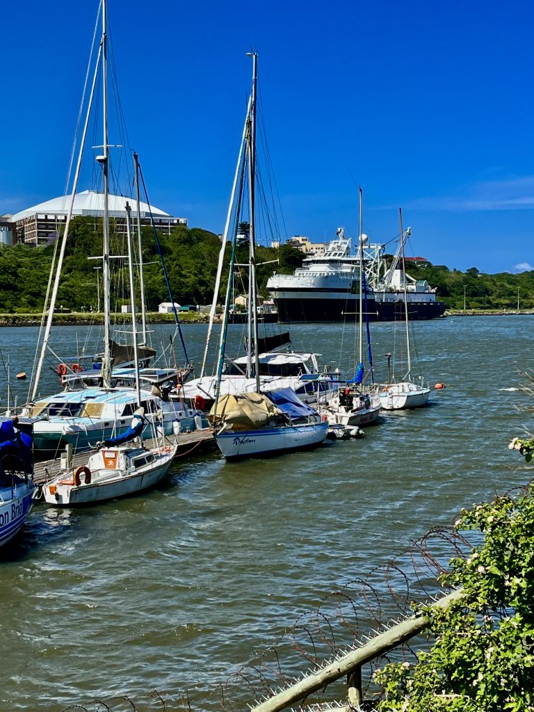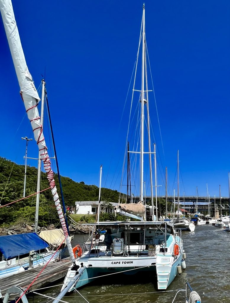 Peter sagt, sie seien hier eine kleine Familie (44 Mitglieder, davon 8 aktive) und wer nicht Teil von ihr wird, ist selber schuld. Jetzt lohnt sich auch unser Flightplan, denn wir müssen keinen weiteren Papierkram erledigen, meint Peter. Er lebt mit seiner Partnerin auf seinem geräumigen Katamaran und gibt uns viele gute, wichtige Tipps für den Aufenthalt hier und für die Weiterfahrt. So sollen wir nicht in Mossel Bay Halt machen, sondern Knysna ansteuern, nicht in die nahe gelegene MALL gehen, da diese wohl sehr gefährlich ist und keine sichtbaren Taschen mit uns tragen. Eine Einladung für alle Langfinger. Ansonsten könnten wir problemlos Taxi, Bus und Uber fahren, um an unsere gewünschten Ziele zu gelangen. Das setzen wir auch gleich in die Tat um, Klaus bestellt ein Uber und wir lassen uns zu einem Super Spar bringen. Die Fahrt führt uns durch East London und wir denken sofort, hier möchten wir nicht zu Fuß unterwegs sein. Zu viele „dunkle“ Gestalten lungern an allen Ecken herum.