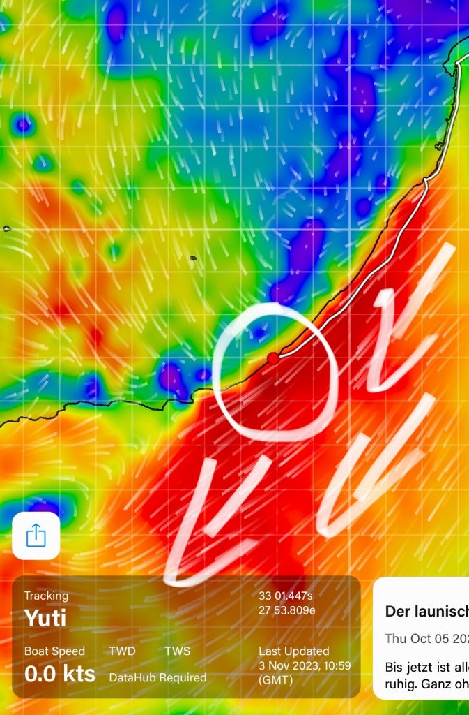 Zum Glück dürfen wir an den Steg und müssen nicht zwischen den komischen Mouringbojen parken. Ehrlich, das würden wir wohl nicht hinbekommen, bei den Wetterbedingungen… Am Steg erwartet uns schon Peter mit seinen Club Kollegen. Peter ist hier der Chef! Und würde ich nicht so schlecht die vordere Festmacherleine werfen, dass sie immer erst ins Wasser klatscht bevor sie jemand fangen kann, wären wir sicher noch schneller am Steg festgemacht. Naja, es klappt dann trotzdem, auch wenn Klaus gut zu kämpfen hat. Und nun liegen wir sicher am Steg des Buffalo River Yacht Club East London.