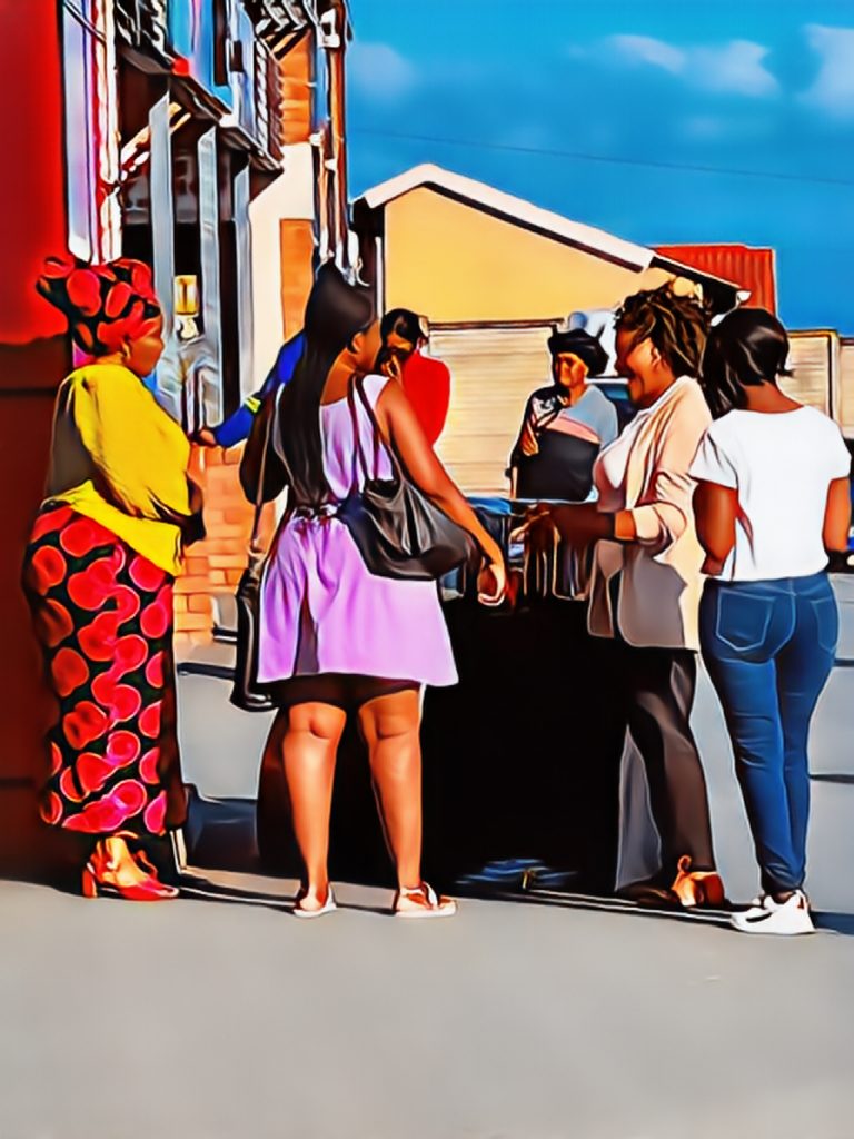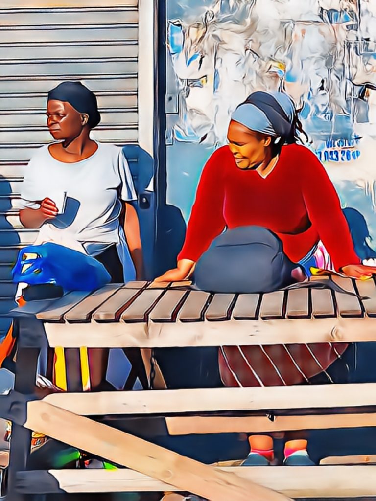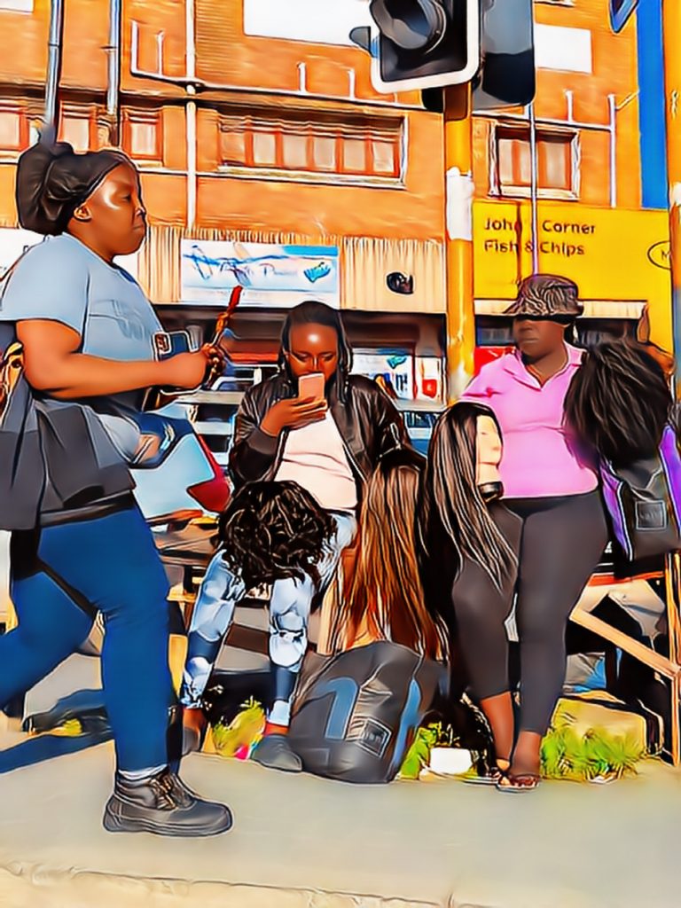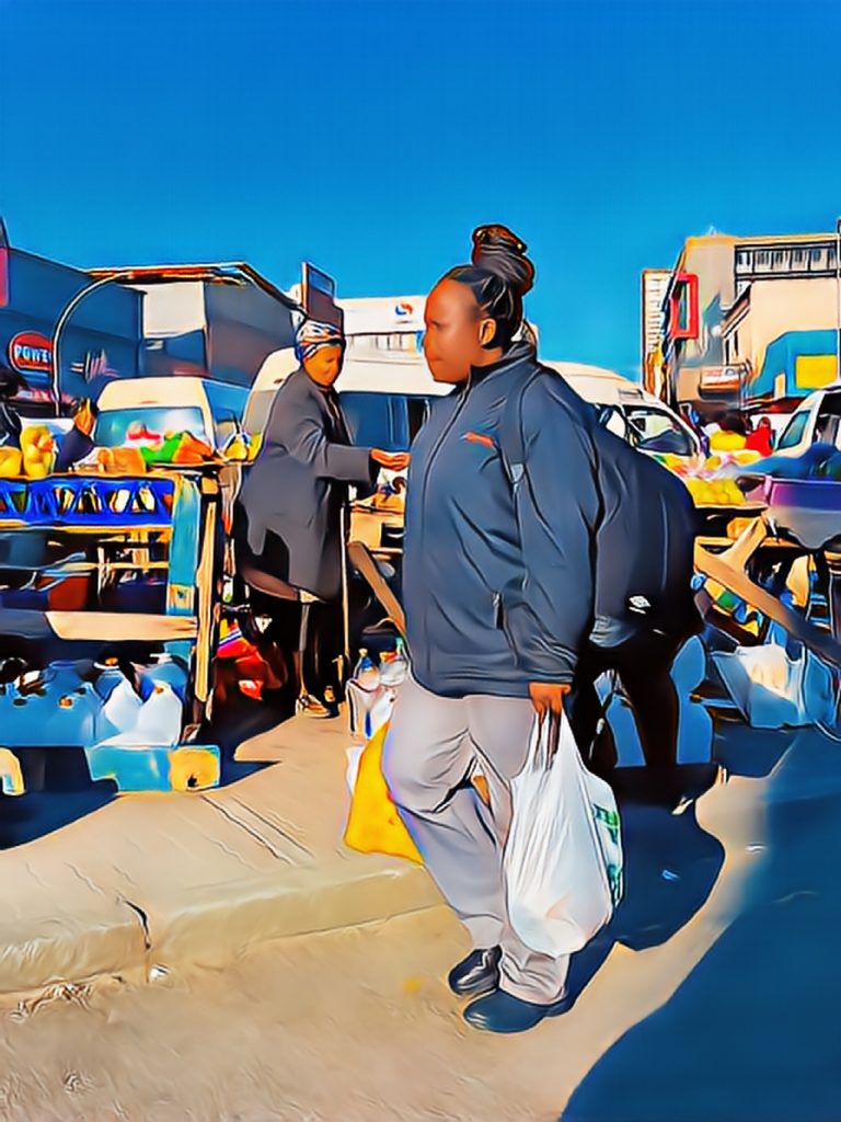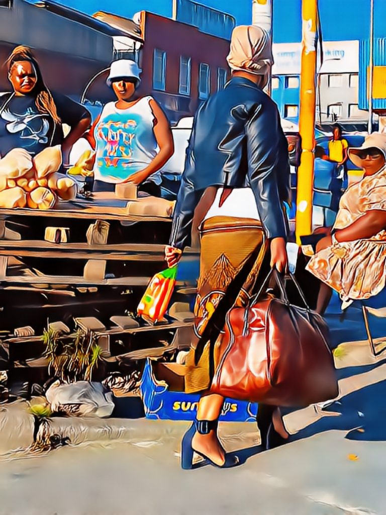 Die zwei Händlerinnen gucken der gestylten Lady neidisch anerkennend hinterher.