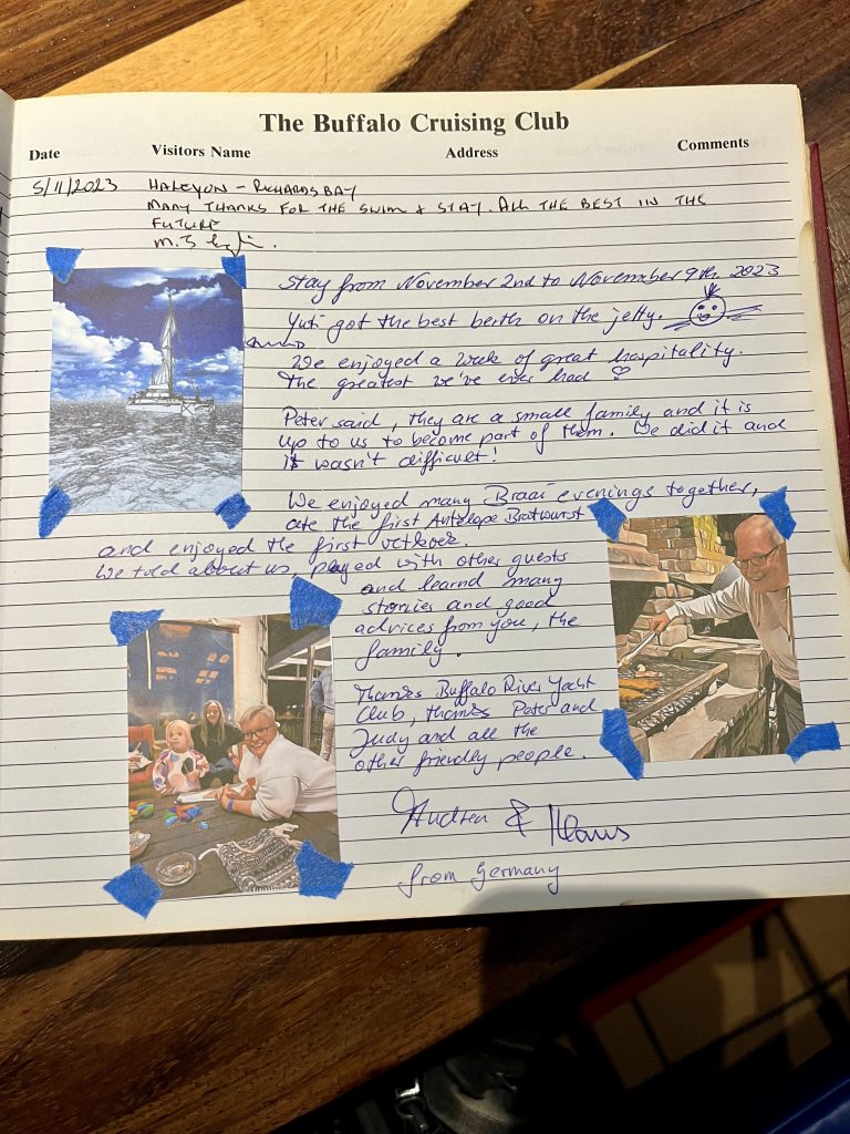 und ein letztes Mal zum Braai in den Club. Nur für uns wird das Feuer entzündet und ich schreibe ins Gästebuch.