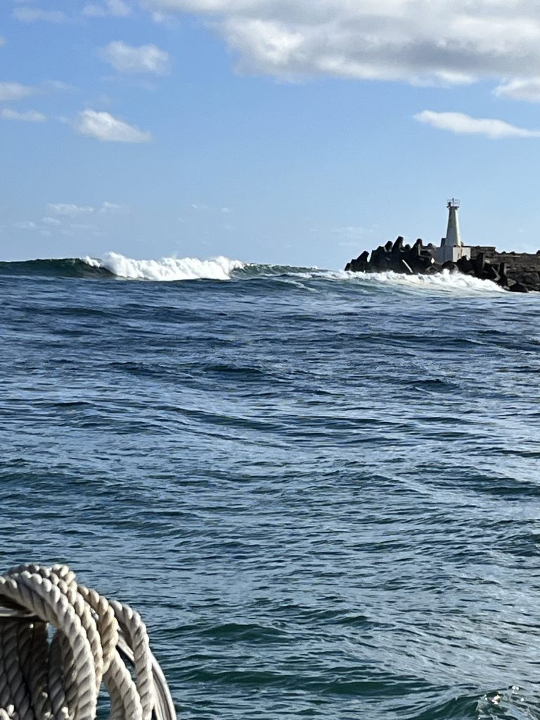 Jetzt aber! Leinen los und ab!! Erstmal motoren wir den Fluss hinunter, raus aufs Meer. Von weitem sehen wir schon die Wellen und den Nebel aus Gischt.