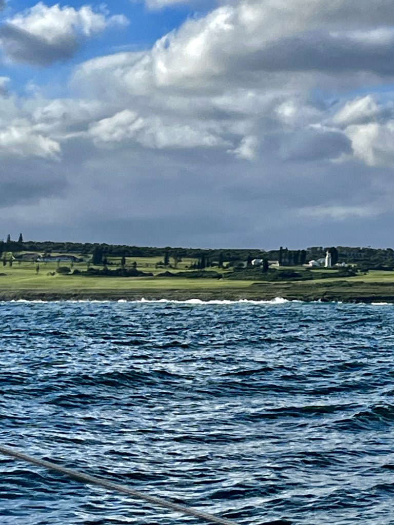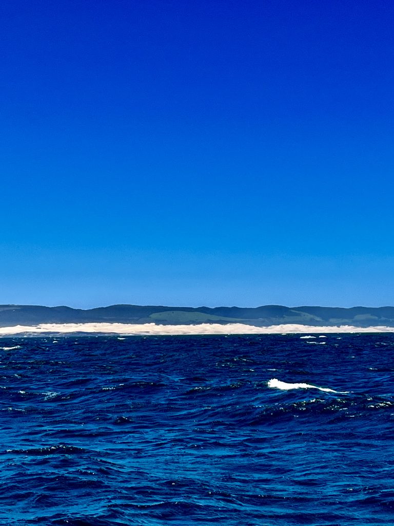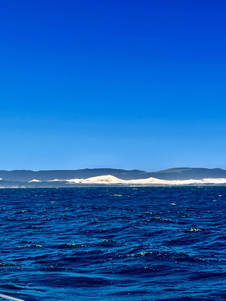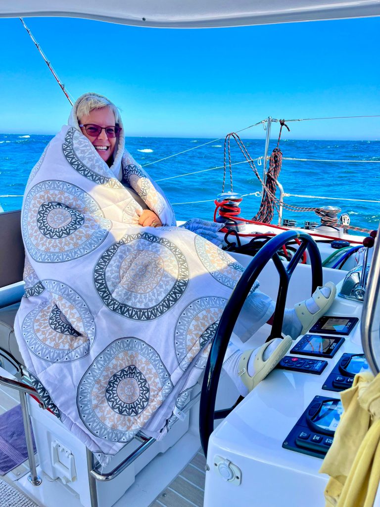 Omma wird‘s zu kalt… 😂. Nein, das ist nicht der Grund. Obwohl es immer frischer wird, je weiter wir uns vom Äquator entfernen und nach Süden gelangen. 20 Grad Tagestemperatur sind schon viel, aber auf dem Wasser fühlt sich das sehr viel kühler an! Nein der Grund sind die Winde und die Windrichtung. Jetzt bläst es von hinten, das ist okay, aber wenn wir zu früh in P.E. eintreffen, finden wir in der Bucht kein ruhiges Plätzchen zum Ankern. Dort ist es dann erst gegen den kommenden Westwind geschützt. Also spielt das Timing eine bedeutende Rolle!