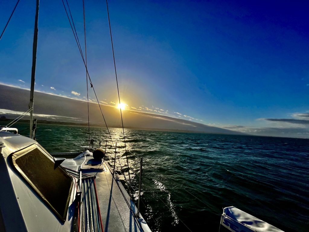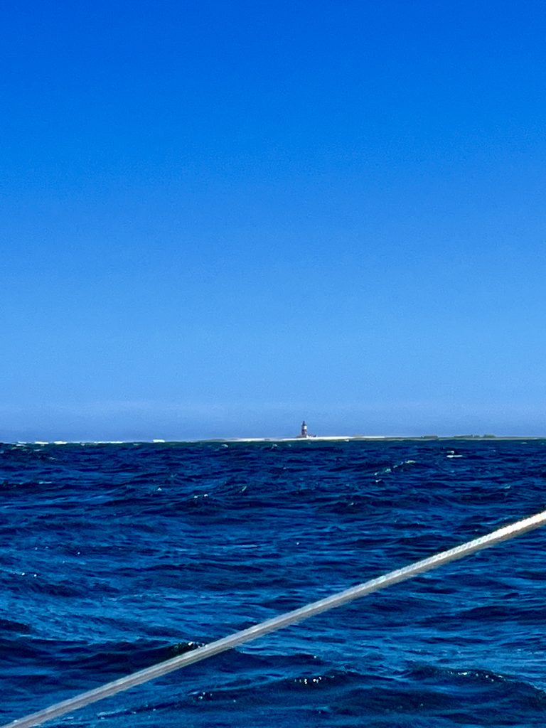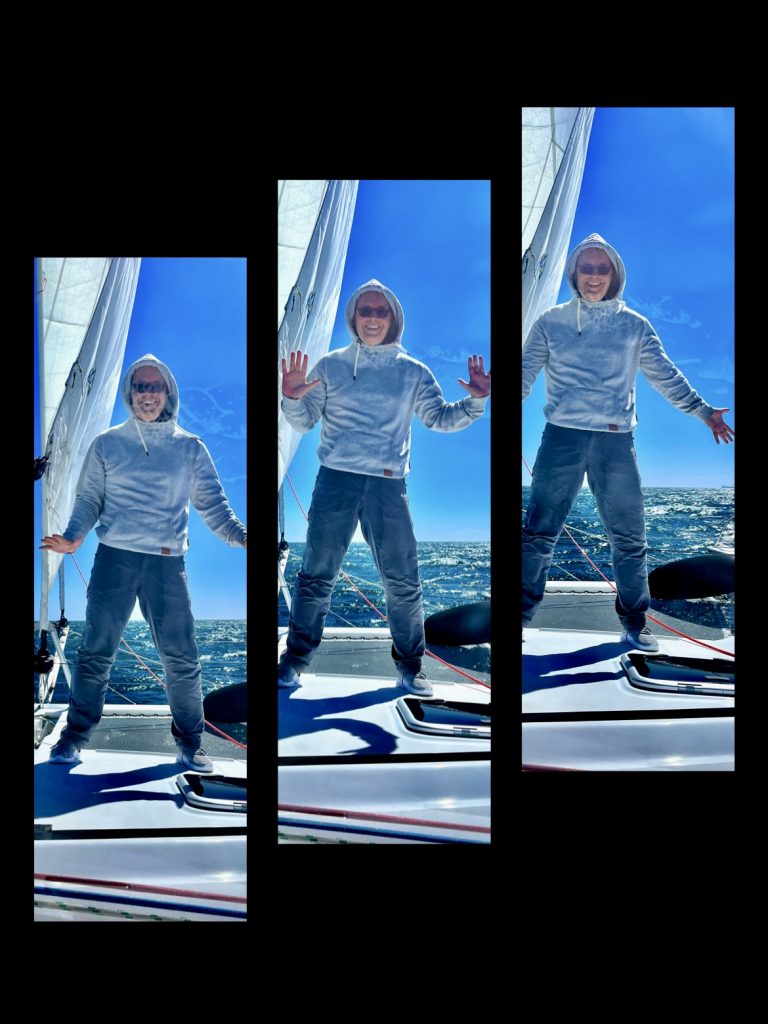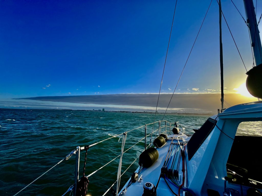 Der Wind nimmt zu. 25 Knoten blasen uns mittlerweile kräftig voran. Schon fast zu schnell 🤔. Das Screecher kommt rein, gar nicht mehr so leicht, das Jib kommt raus. Etwas später verkleinern wir auch das Jib auf die Hälfte, um nicht zu schnell zu werden. Warum?