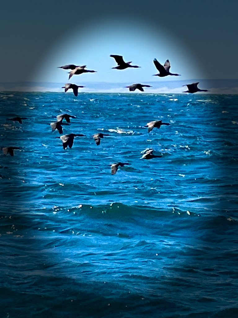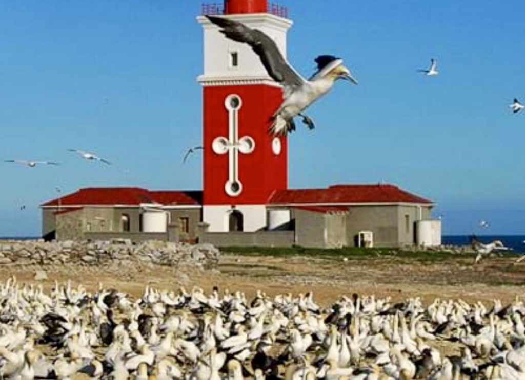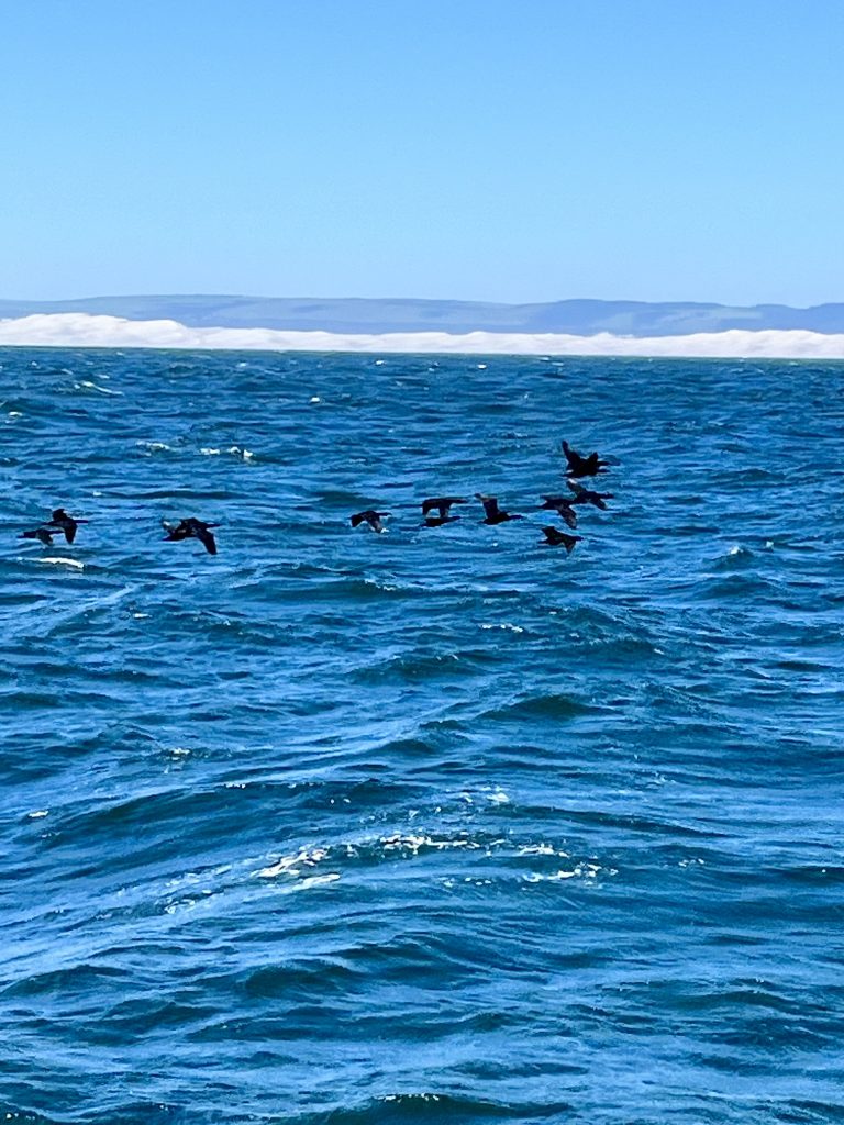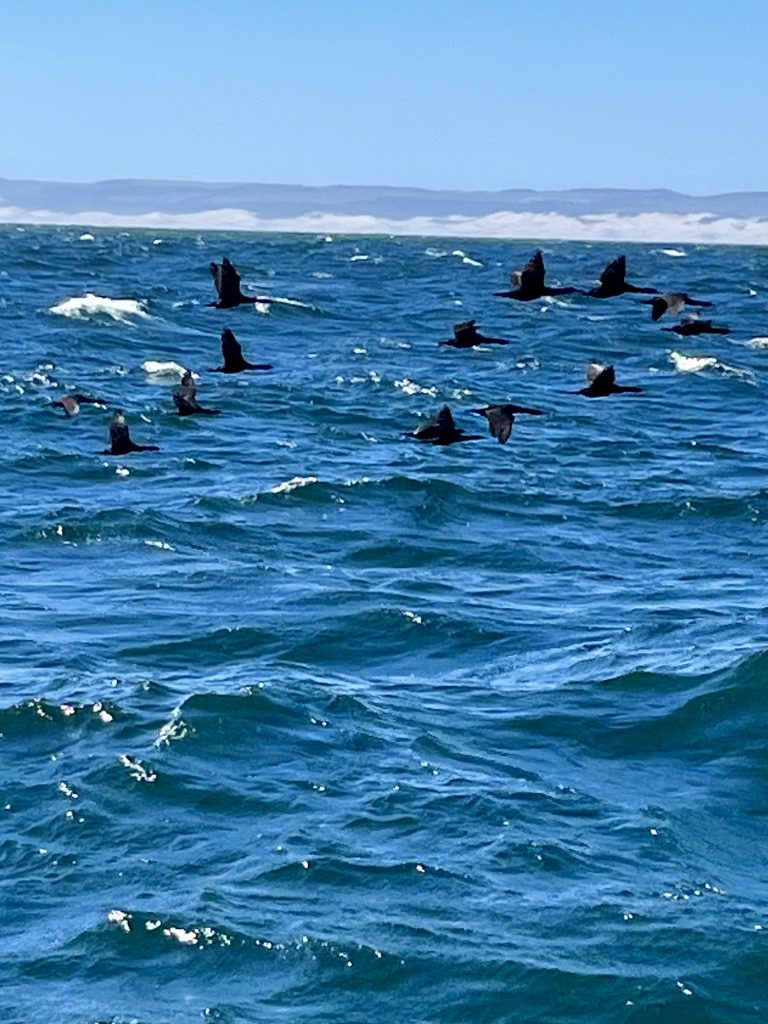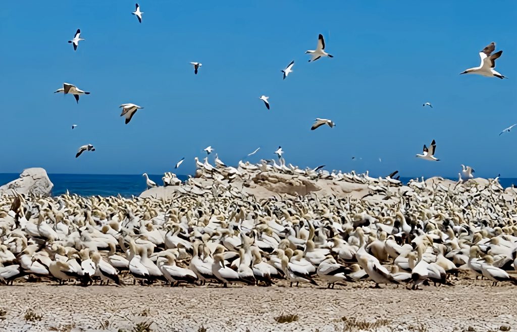 Nicht nur verschiedene Arten von Seemöven und Seeschwalben leben dort, auch Kormorane, Kaptölpel und Afrikanische Pinguine. Ein Naturschutzgebiet der besonderen Art. Auch Weiße Haie tümmeln sich dort gern, da um diese Inseln nicht gefischt werden darf. Das alles sehen wir nur von weitem, aber die Wolken von weißen Vögeln, über weißem Sand, können wir gut erkennen. Und viele der Vögel sind unterwegs auf Fischfang.