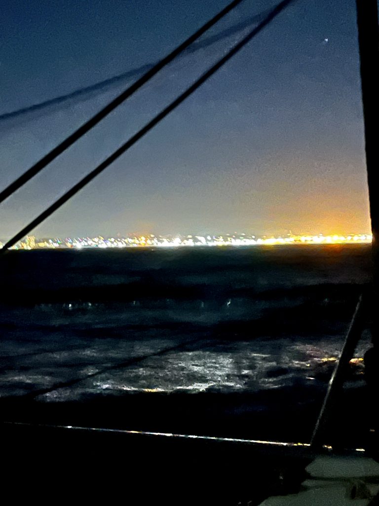 Wir sind weiterhin zu schnell! Also segeln wir mal ein paar Schlangenlinien. Wir sind NICHT betrunken! Trotzdem Achtung, Achtung, wir haben zunehmend Gegenverkehr. Einige große Frachter kreuzen unseren Zick-Zack-Kurs. Im Moment klatscht eine Welle, wie aus dem Nichts, in den Steuerstand. Na Danke! Alles ist wieder mit Salzwasser besudelt. Es wird dunkel….