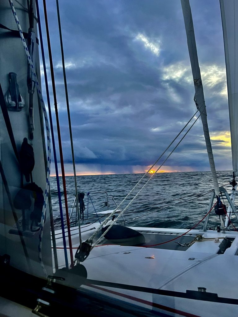 11:06 Uhr, die Sonne lugt hervor. ⛅️ Die Strömung hat gedreht und unterstützt uns nun ein wenig. Wir fahren stark am Wind, ein Motor unterstützt mit 1.800 Umdrehungen. Wir warten auf den kompletten Windwechsel, der für mittags angesagt wurde. Da müsste er dann perfekt von schräg hinten blasen. Das wäre dann wieder Screecher Time.
