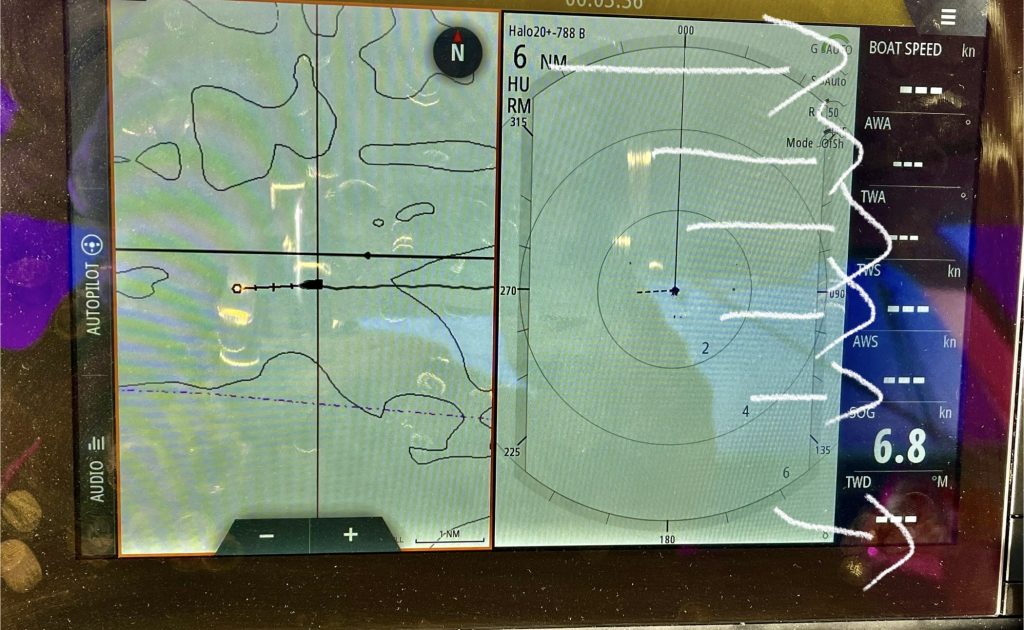 20:42 Uhr, der Autopilot fällt aus. 😳 Nein, ALLES fällt aus. 😱 Ach du Schande❗️Wir haben keinerlei Angaben mehr. Keinen Wind, Stärke und Richtung, keinen Boatspeed durchs Wasser, keine Tiefenangaben. Alles Angaben, die wir dringend zum Segeln brauchen. Dazu ist es dunkel geworden. Nur noch der Bildschirm ist hell und zeigt uns die von Klaus vorgegebene Route und den Speed über Grund an. Das Allerschlimmste ist jedoch der Ausfall des Autopiloten‼️Wir müssen sofort auf Handsteuerung umstellen. Das bedeutet, einer von uns muss jetzt ununterbrochen draußen am Steuer stehen und nonstop alles händisch ausgleichen, was unser Autopilot so selbstverständlich und ohne Ermüdung, all die Zeit zuvor tat. Kurz und überraschend kommt alles wieder zurück, um Minuten später erneut zu verschwinden.