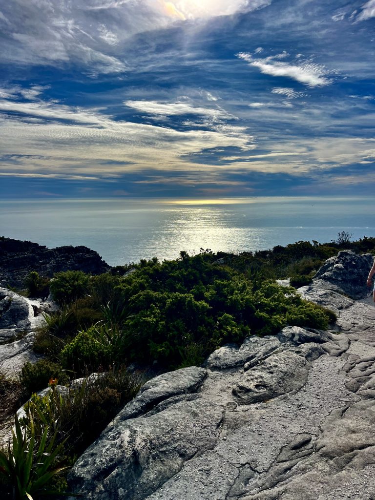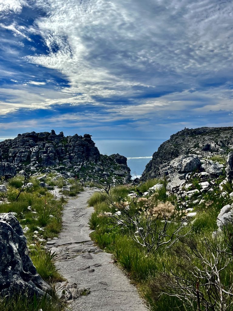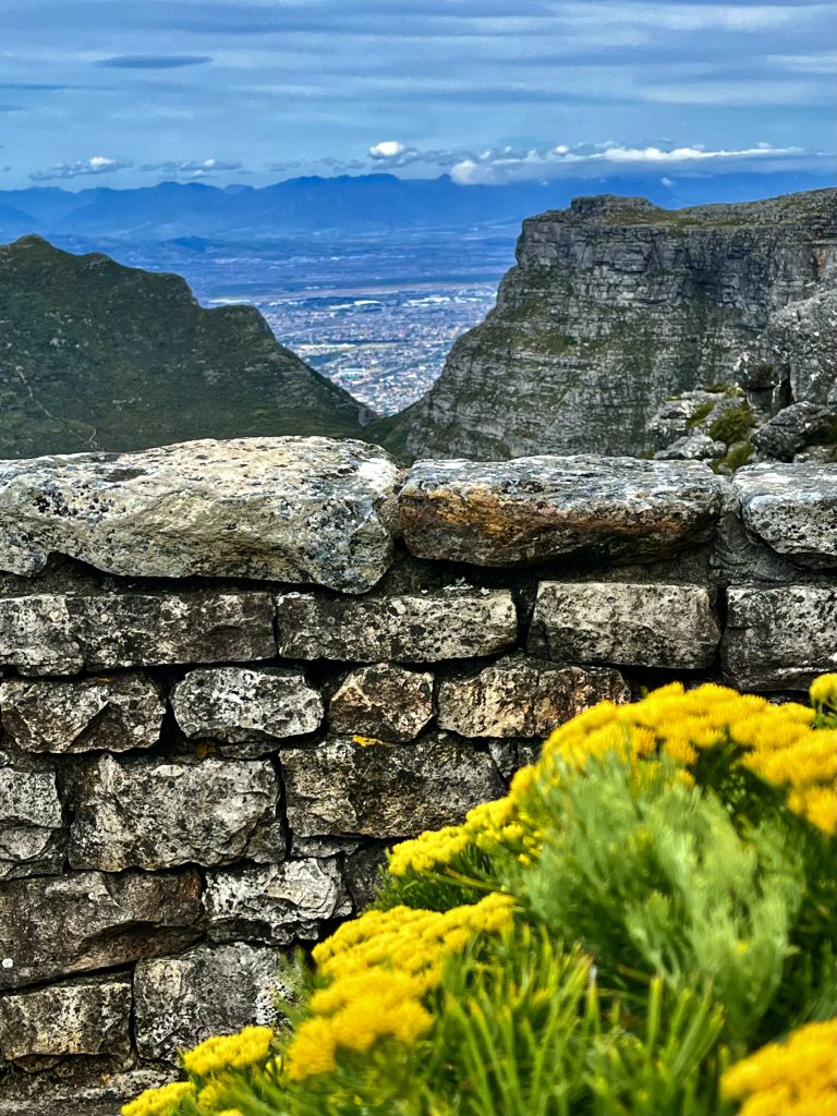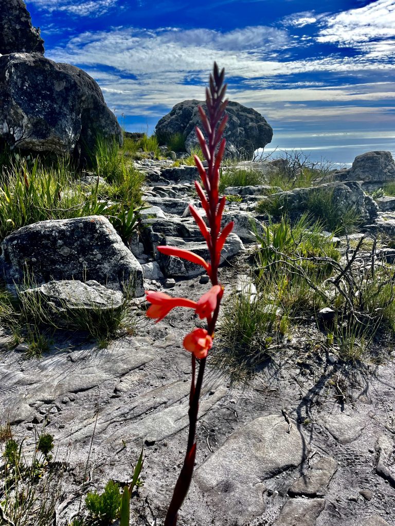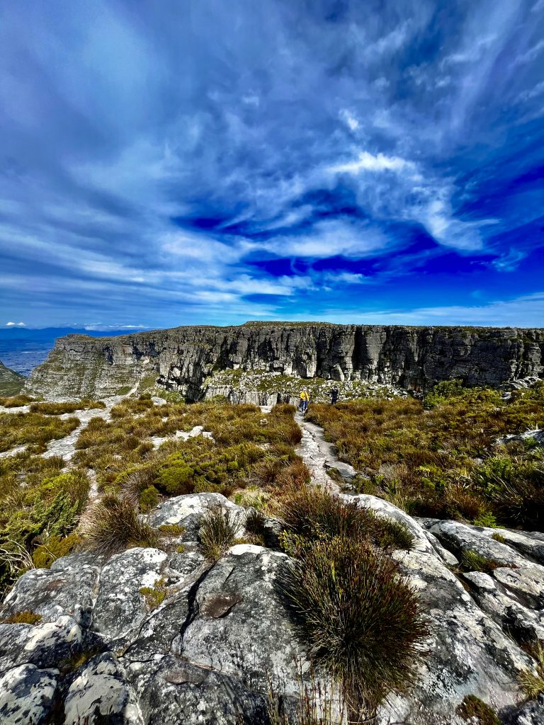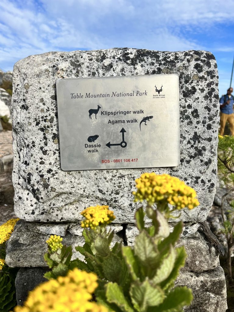 Von allen möglichen Richtungen, hat man einen tollen Blick auf Kapstadt, am Fuße des Tafelbergmassivs. Ein Gebirge von 6.500 ha Fläche. Und das wollen wir jetzt alles ablaufen… 😂. In der Tat gibt es verschiedene, ausgeschilderte Wanderwege auf dem Plateau, mit immer wieder neuen Ein- und Ausblicken.