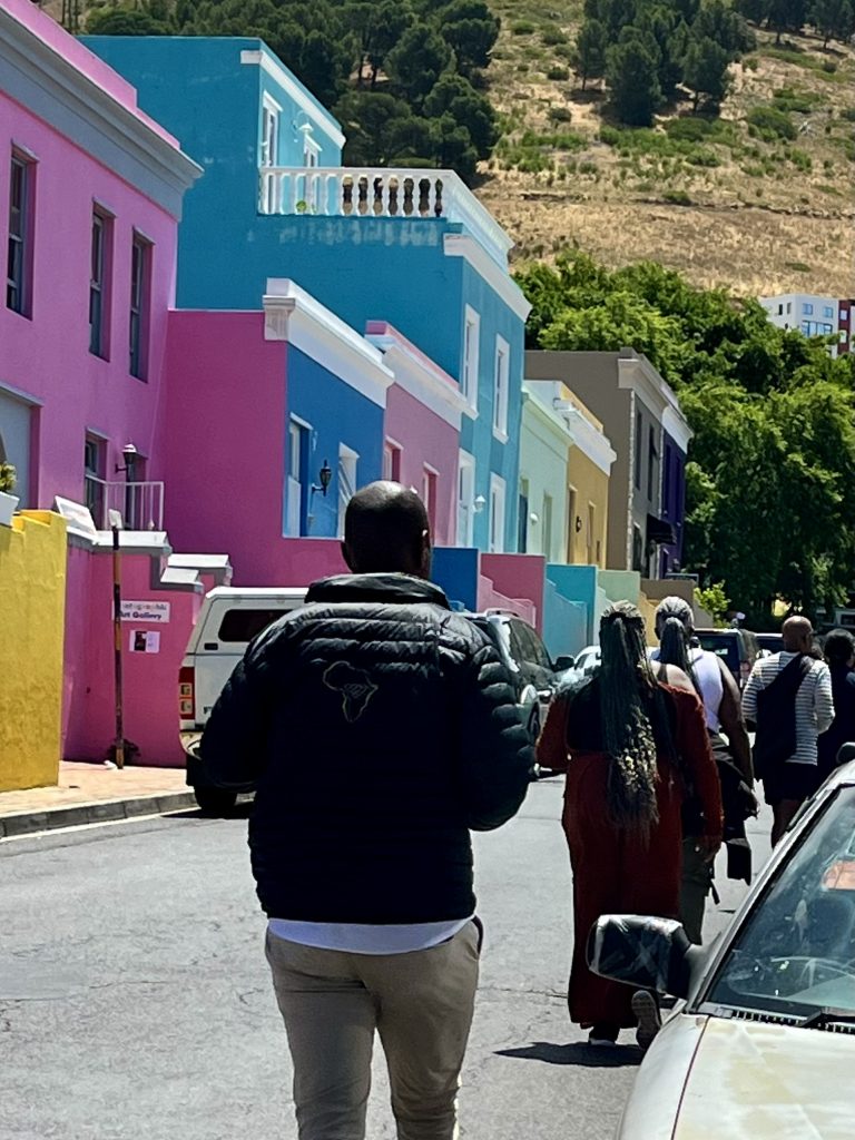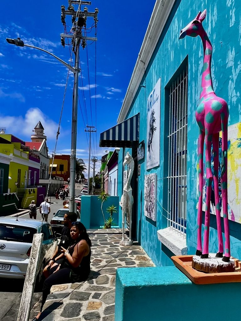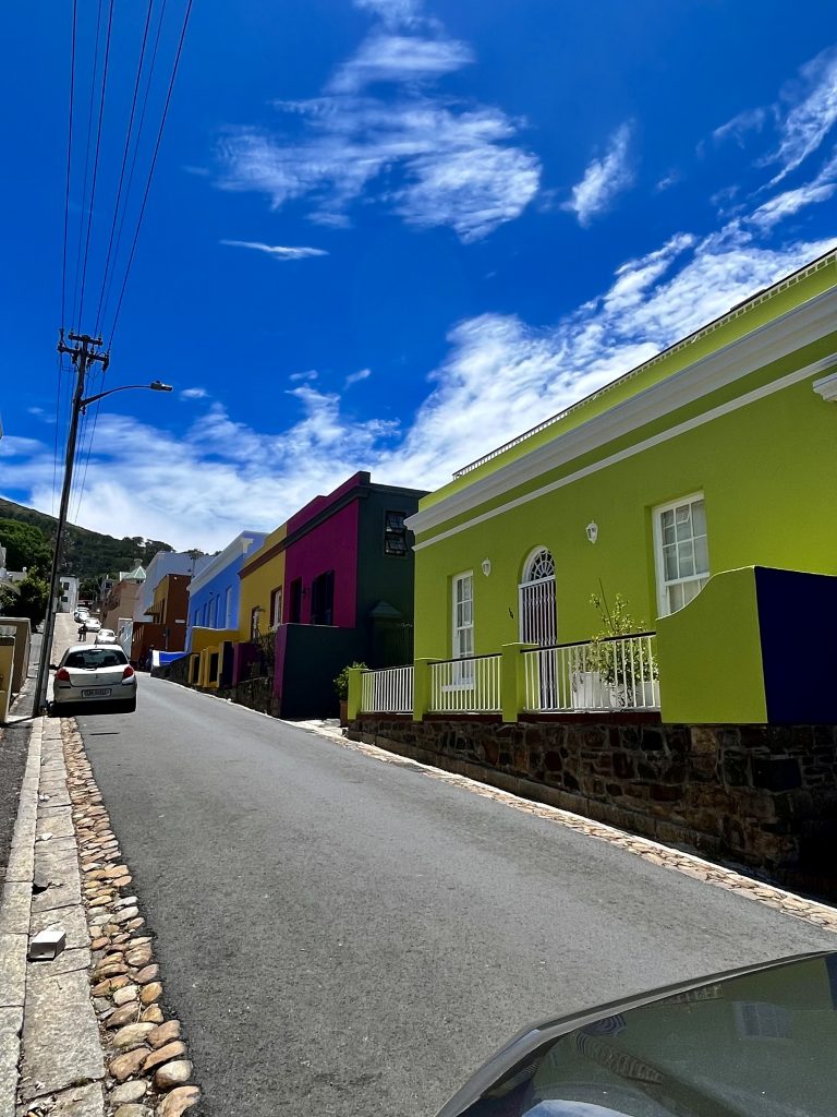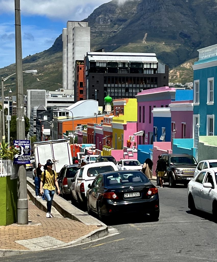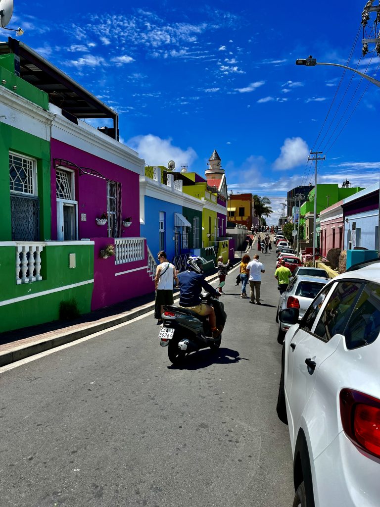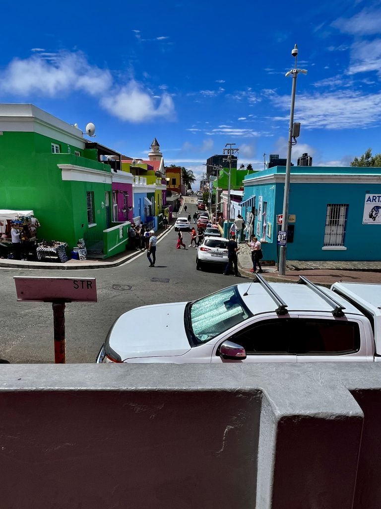 Nun schauen wir uns mal die Stadt am Fuße des Tafelbergs an. Das wunderschön gelegene Kapstadt, zwischen Bergmassiv und Meer. Eine ganz besondere und einmalige Kulisse. Wir machen einen Stadtspaziergang, nachdem uns ein suuuper netter Uber Fahrer hingebracht hat. Wir haben eine sehr lebhafte Unterhaltung während der Fahrt. Er beschreibt uns seine Kundschaft, überwiegend Deutsche… Sie wären, anders als wir, eher ernst und sorgenvoll. Sie, die Südafrikaner hätten auch Säcke voller Probleme und Schicksalsschläge zu verkraften, aber sie gingen anders damit um. Ein Tag ist man betrübt, dann ist die Fröhlichkeit wieder zurück. So lebt es sich definitiv besser. Auch würden sie hier in Cape Town viel und hart arbeiten, aber immer mit Spaß und einem lächelnden Move, einer beschwingten Fröhlichkeit. Die andere Seite sei halt die große Armut weiter Teile der schwarzen Bevölkerung. Die führe zu Drogenkonsum und Kriminalität. Aber, seit sie eine Weiße mit deutschen Wurzeln als Bürgermeisterin hätten, ist vieles besser geworden. Ja, das hatte Klaus schon recherchiert. Sie hat unter anderem dafür gesorgt, dass es ein großes Personalnetz an Security Leuten gibt, in und um Cape Town. Übrigens leben 30.000 Deutsche in der Stadt und 100.000 Deutsche haben hier ihren Zweitwohnsitz. Na dann mal los. Wir beginnen unseren Spaziergang in Bo Kaap, dem moslemischen Viertel, mit seinen hübschen, bunten Häusern, kleinen Kunstgalerien und Lädchen.