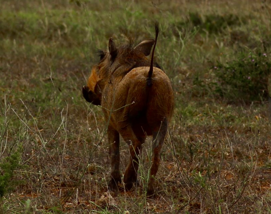 und hält Ausschau. Nach was, den Ugly Five? Wer gehört denn da dazu? Das Gnu, die Hyäne, der Geier, das Warzenschwein und der Marabu. Drei haben wir ja schon gesehen. Mashudu meint, die Warzenschweine würden immer nur rumrennen…Dass da mal eins still steht, ist wohl die reine Ausnahme. Und damit die kleinen Warzen auch sehen wo Mama so längs läuft, ist der Schwanz immer aufgerichtet. So schaut die Schwanzspitze aus dem Gras heraus, wie der Regenschirm eines Touriguides.