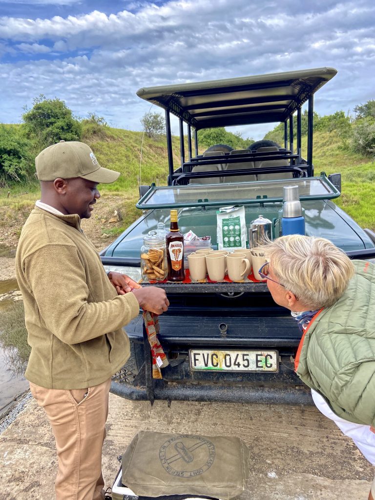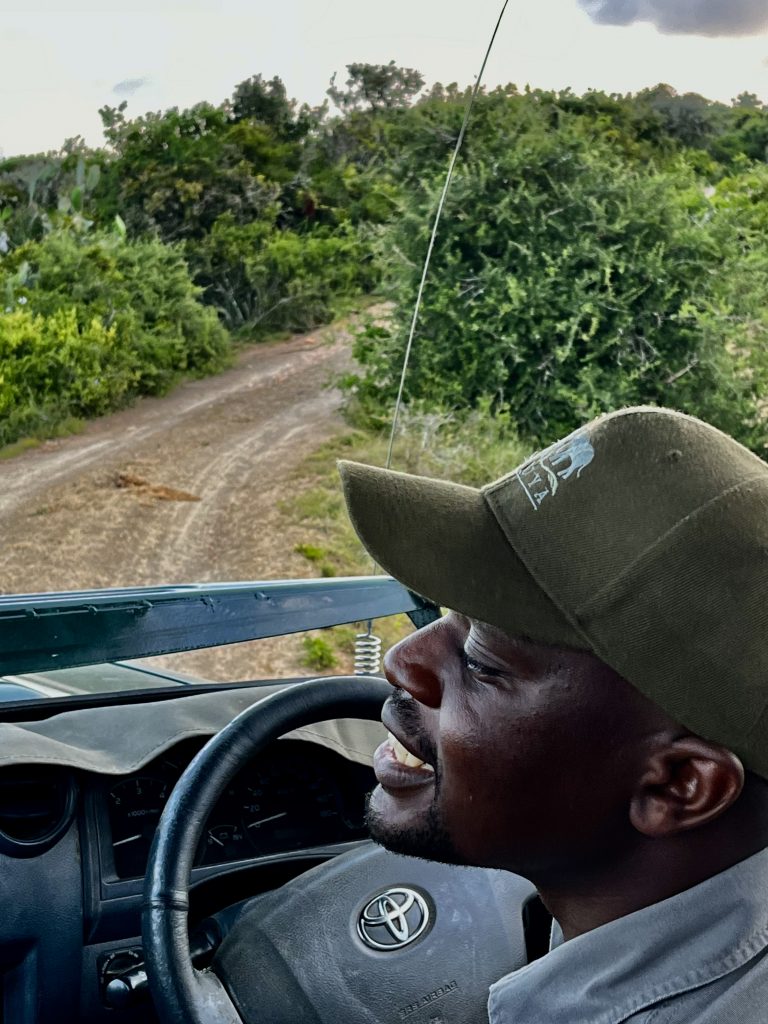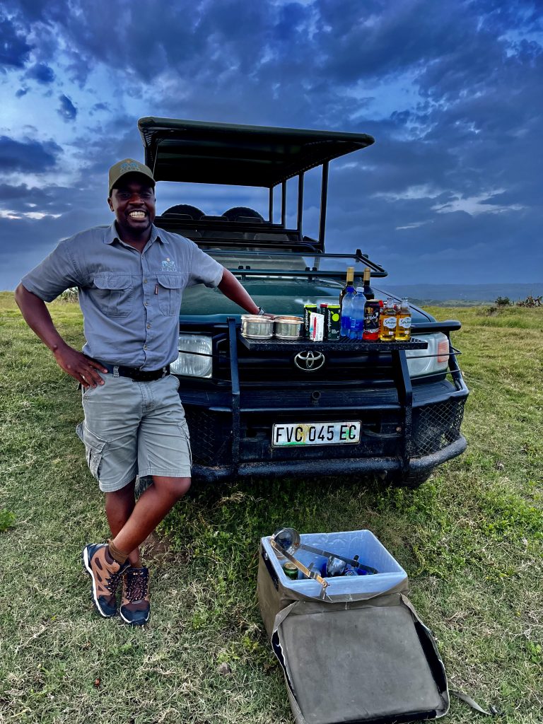 Das Mittagessen steht an und der Wachwechsel noch dazu. Kaleb übergibt den Stab an Mashudu. Mashudu, ein absoluter Sunny Boy übernimmt. Mit dem werden wir wohl viel Spaß haben 😁 Um 16:00 Uhr geht’s wieder raus in den Busch. Frage von Mashudu, Löwen suchen oder Ferrari-Safari? Ohne zu wissen was damit gemeint ist, sind wir für Ferrari-Safari. Wir, das sind jetzt auch noch Dagmar und Hans, ein weiteres deutsches Paar, sehr nett! Na dann mal los. Kläusi hat heute mal unseren Feldstecher mit dabei
