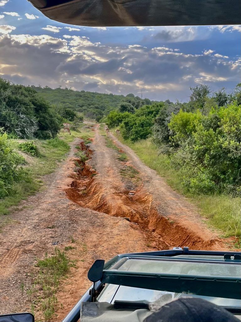 Und jetzt wird der Turbo eingelegt, denn Mashudu möchte noch die Elefanten erwischen, bevor sie zum Schlafen im Busch verschwinden. Ah, jetzt kommt also die Ferrari-Safari. Alle festhalten bitte…