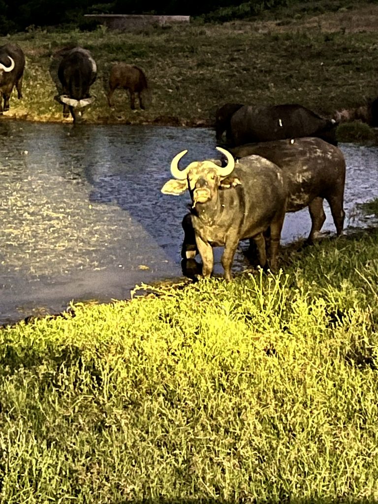 Wir verlassen nun diesen wunderbaren Ort und nehmen den Rückweg in Angriff. Mashudu möchte uns noch die Büffel zeigen. Jo, das wäre ja toll! (Auf Afrikaans sagt man Jo statt Ja.) Und am Wasserloch sind sie dann auch alle versammelt. Doll!