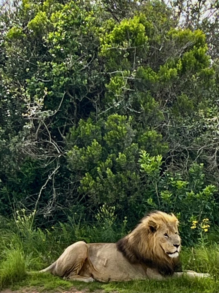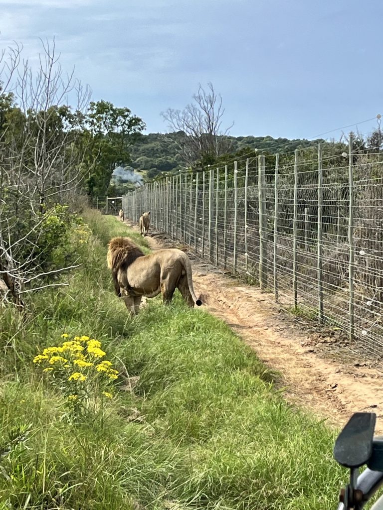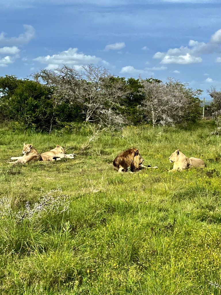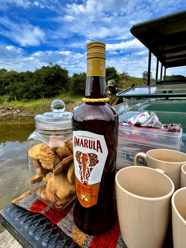 Ein Tütchen Instantkaffee, ein Tütchen Kakao, heißes Wasser und einen guten Schluck Amarula Creme. Ich kann euch sagen, das schmeckt echt lecker! 😋 Selbstgebackene Kekse sind auch noch mit dabei. Ach, was geht es uns gut❣️ Danach, ein ganz klein bisschen angeschickter, geht’s ins Löwengehege. Und als hätten sie etwas gutzumachen, täräää 🥳, liegen sie alle Vier, kurz hinter dem Einlang, auf einer Lichtung.