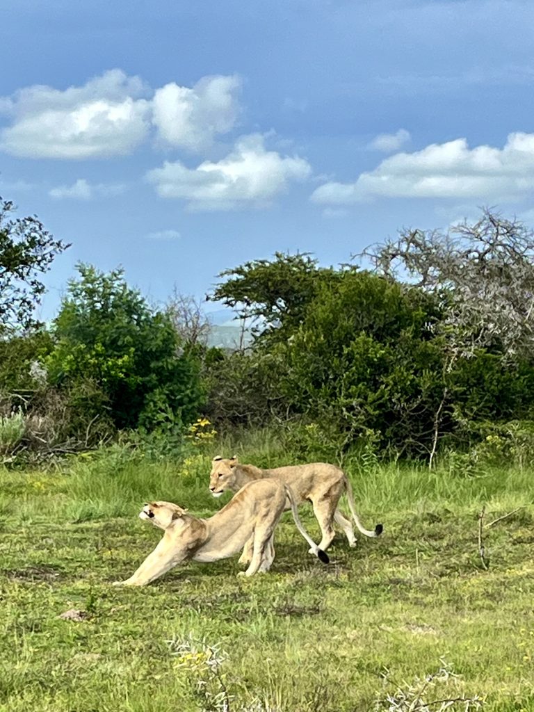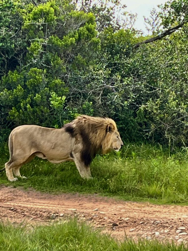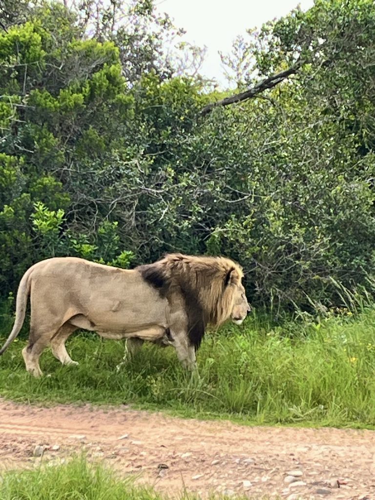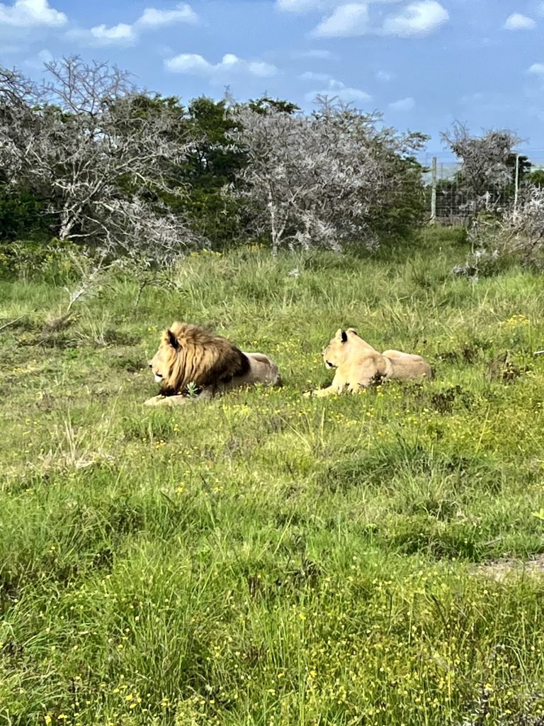 Ein Tütchen Instantkaffee, ein Tütchen Kakao, heißes Wasser und einen guten Schluck Amarula Creme. Ich kann euch sagen, das schmeckt echt lecker! 😋 Selbstgebackene Kekse sind auch noch mit dabei. Ach, was geht es uns gut❣️ Danach, ein ganz klein bisschen angeschickter, geht’s ins Löwengehege. Und als hätten sie etwas gutzumachen, täräää 🥳, liegen sie alle Vier, kurz hinter dem Einlang, auf einer Lichtung.