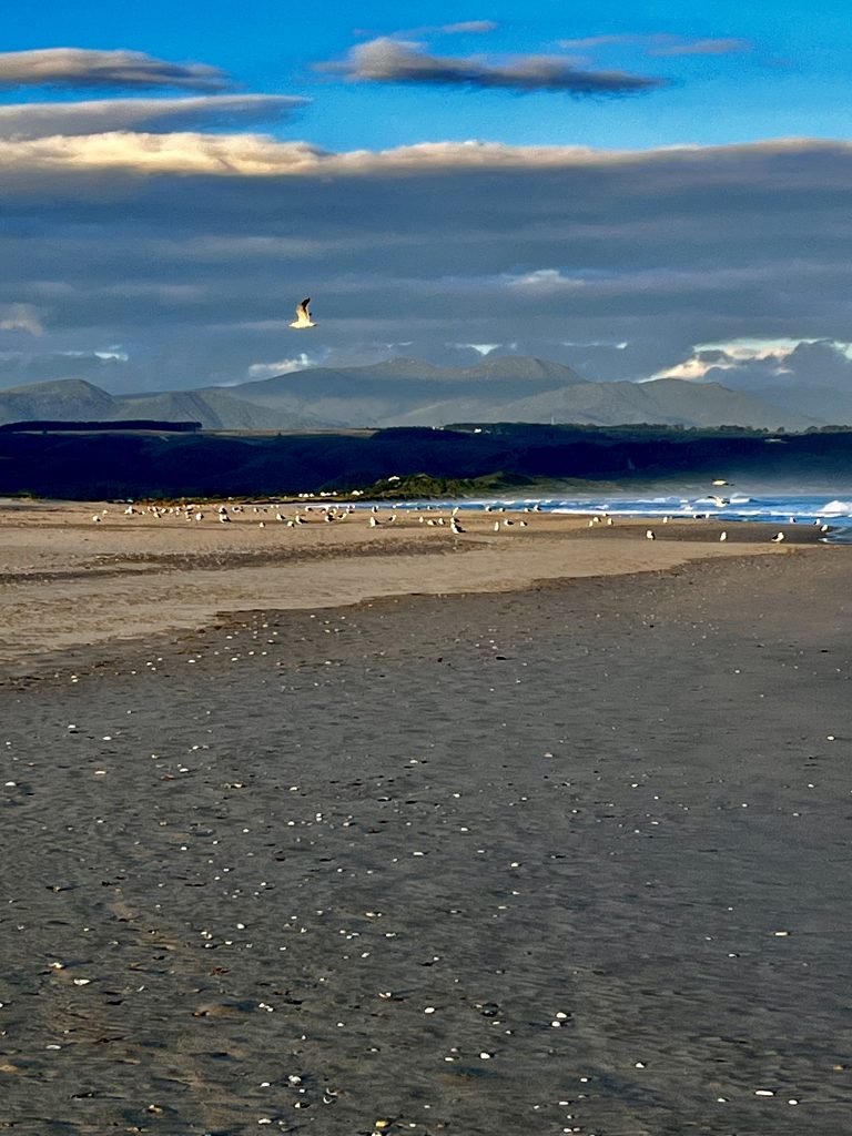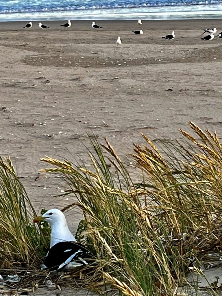 Einen Abstecher möchte ich noch machen und zwar zur Strandzunge, wo viele Möwen im Sonnenuntergang sitzen oder herumfliegen. Ach, die brüten ja! Und viele kleine graue Küken hüpfen durchs Strandgras. Ich wage mich sehr nah heran,