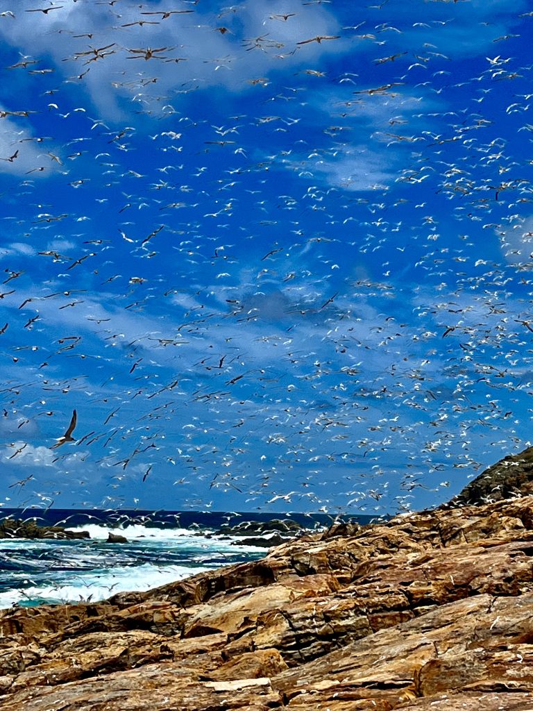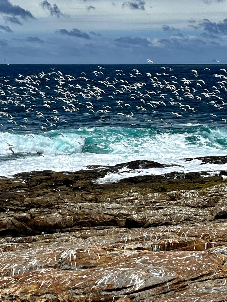 Es ist absolut magisch in dieser rauschenden Wolke von weißen „Schneeflocken“ zu stehen!!! Sie fliegen auf und tanzen im Himmel von links nach rechts und zurück. Weder Seeschwalbe noch Möwen greifen mich an. Sie rauschen um mich herum und an mir vorbei. Ein fantastisches Gefühl, einfach überwältigend! Die Kormorane bewegen sich übrigens keinen Zentimeter. Am liebsten würde ich noch ewig hierbleiben, aber wir müssen weiter, der Weg ist noch lang. Auf Wiedersehen, ihr schönen Himmelsgeschöpfe. 😘