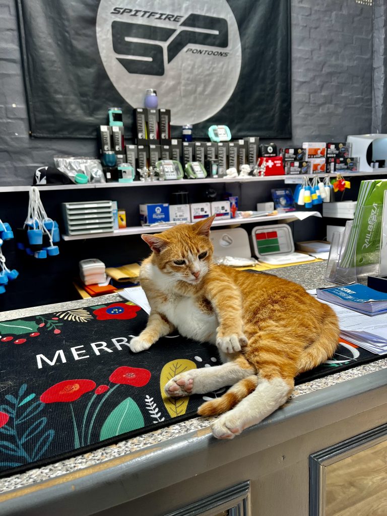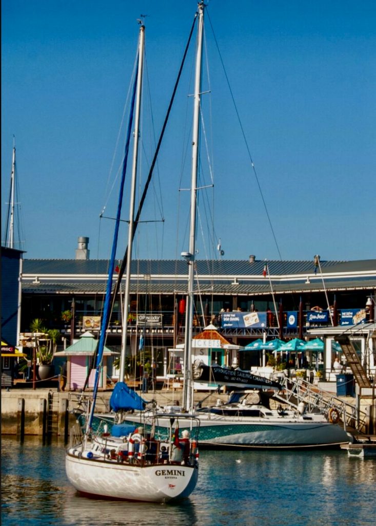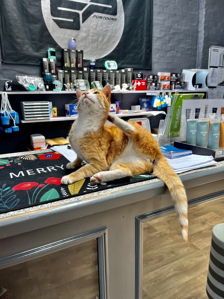 Hier gibt es viele hübsche Geschäfte, nette Cafés und Restaurants. Wir lassen uns in einem nieder, bestellen und wums, ist der Strom weg. Die Generatoren laufen, aber gekocht werden kann dennoch nicht. Okay, dann gibt’s halt nur etwas zu trinken. Das mit den Stromausfällen ist in ganz Südafrika ein tägliches Dauerproblem. Alle sind genervt! Wir bekommen es auf dem Boot ja nicht wirklich mit, denn Solar geht immer sobald die Sonne lacht, und wenn nicht, können wir die Motoren kurz laufenlassen und produzieren über unsere Lichtmaschinen die benötigte Energie. Klaus möchte hier im Yacht Club nach einer Chandlery Ausschau halten. Etwas fürs Boot brauchen wir immer. Jepp, wir haben sie gefunden. Bloß hat hier ne Katze das Sagen! 😄