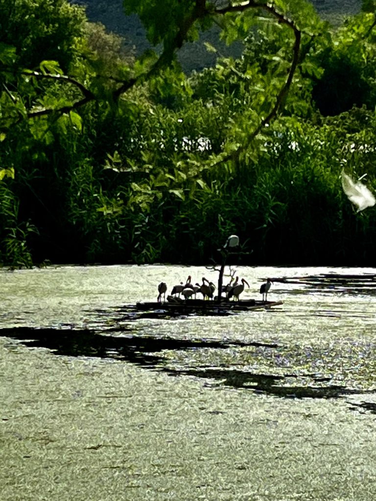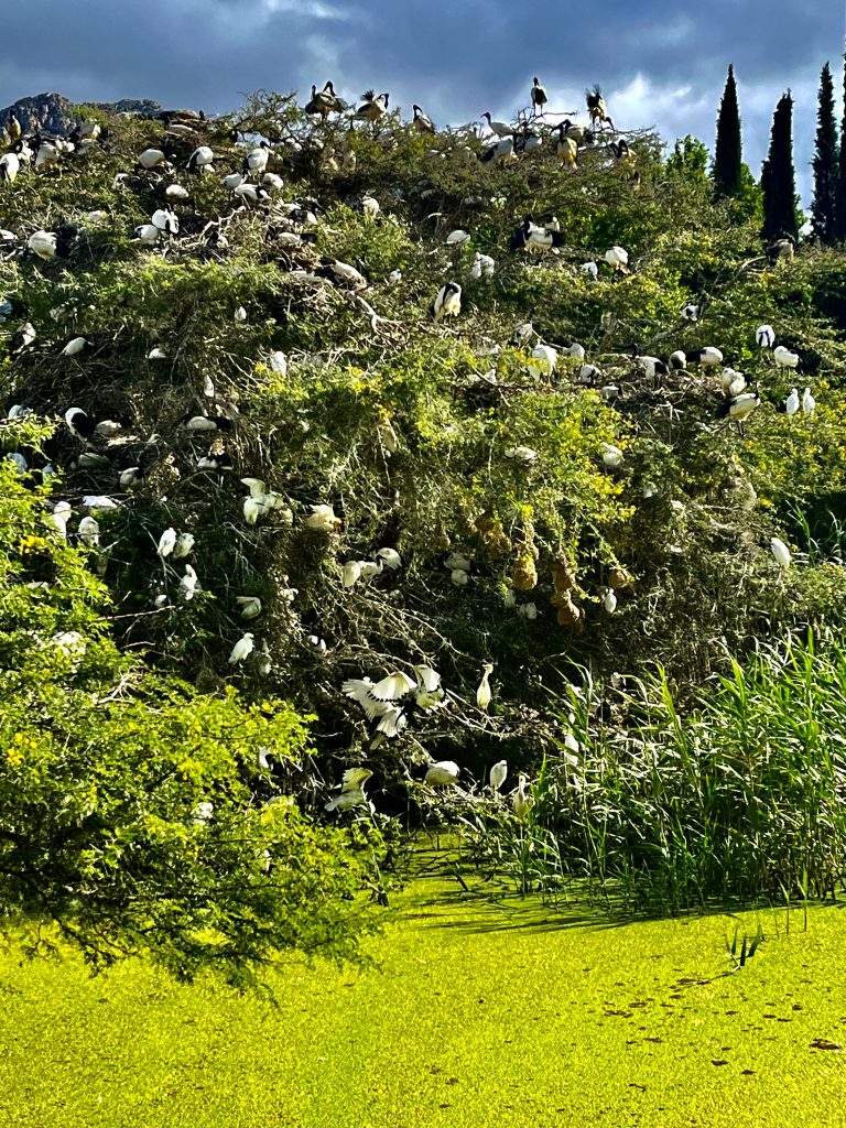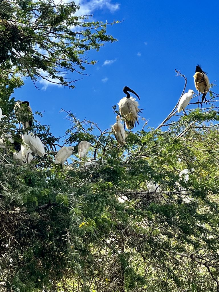 Wer wohnt denn hier alles? Da haben wir verschiedene Arten von Reihern, Masken Weber mit ihren kunstvollen Kugelnestern und große Mengen der Heiligen Schwarzkopf Ibisse, mit ihren geschwungenen Schnäbeln. Ja, diese Art der Ibisse heißt tatsächlich so.