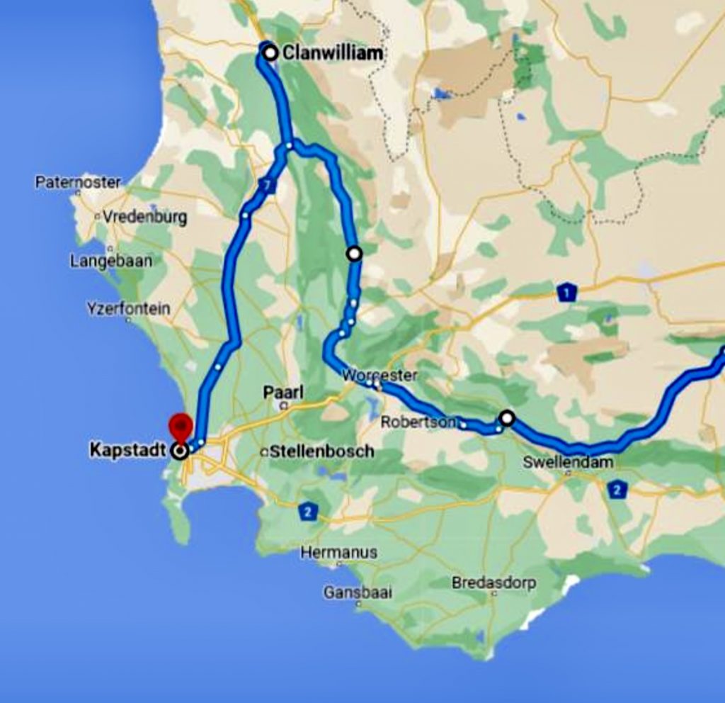 Am heutigen Tag wollen wir einer weiteren Empfehlung unseres Hoteliers folgen und in die Cederberge klettern, um einen Wasserfall zu bestaunen. Also ab durch die Mitte.