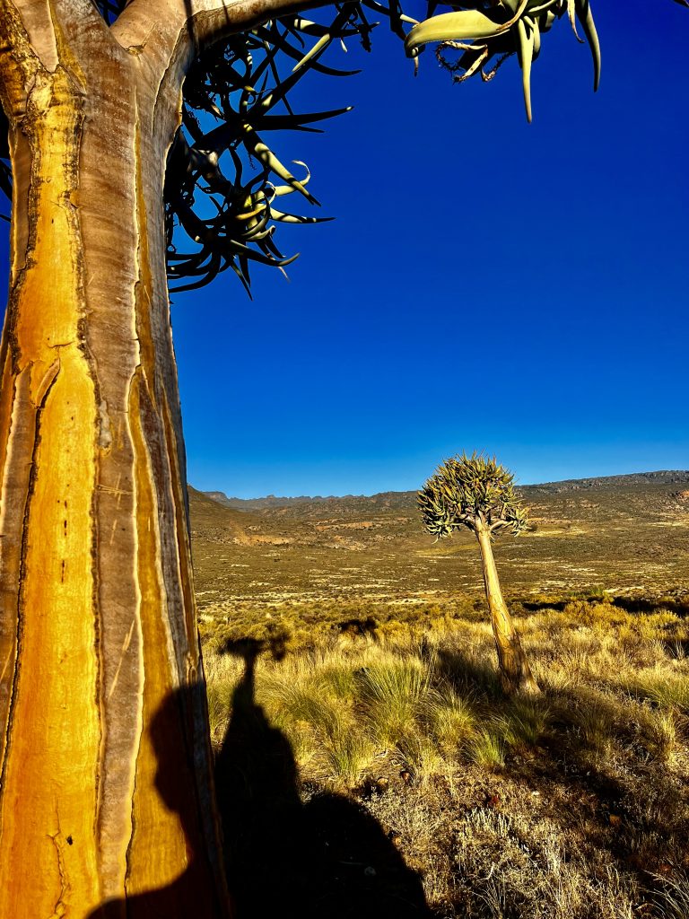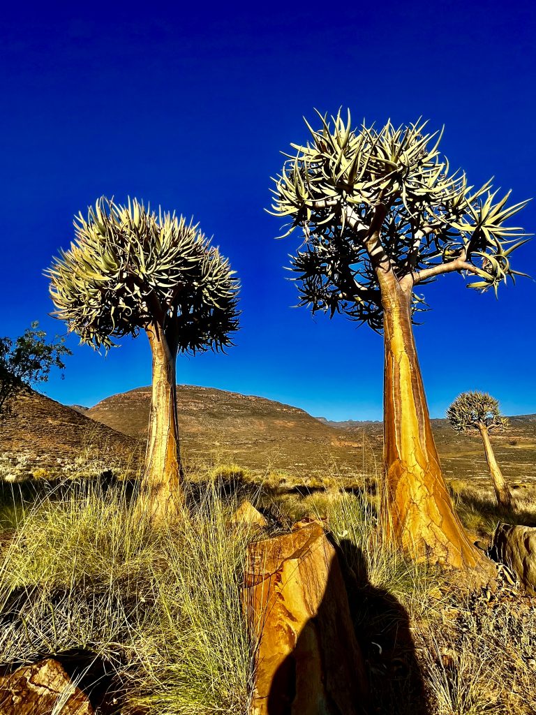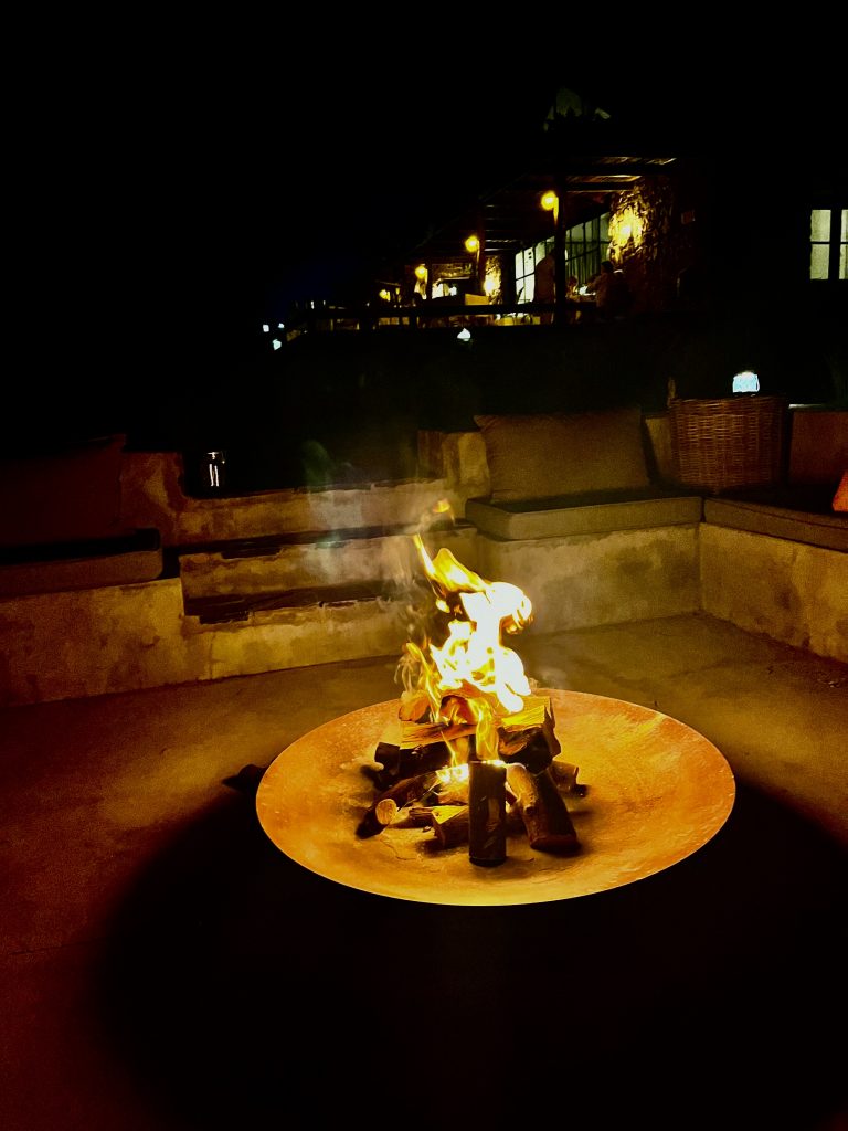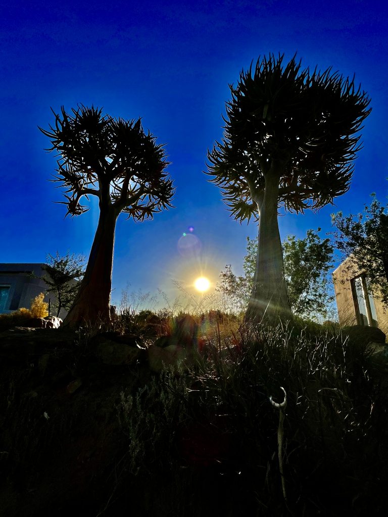 Beide bestellen wir ein ganzes Menü. Es werden kleine, feine Portionen sein. Nur eines irritiert uns sehr! Nirgendwo finden wir Preise. Auweia, das wird bestimmt teuer. Zumindest ist alles sehr lecker! Sterneküche eben. 😋 Apropos Sterne… Nach dem Dinner, wenn die Sonne vollständig untergegangen ist, wird vom Haus eine Sternenkunde angeboten. Wir dürfen als Outsider teilnehmen, kostenlos. 🤩 Aber was sind denn das nun für Bäume, die ich fotografiert habe? Erstmal hat keiner ne Ahnung. Es wird in der gesamten Belegschaft nachgefragt. Einer weiß es. Das sind Kokabooms, sie werden auch Quiver Trees / Köcherbäume genannt. Okay, dann weiß ich jetzt Bescheid. 👍 Bevor es zum Sternegucken geht, hat es noch Zeit, und wir nehmen mit unseren Getränken am Feuerplatz Platz, welches umgehend für uns entzündet wird.