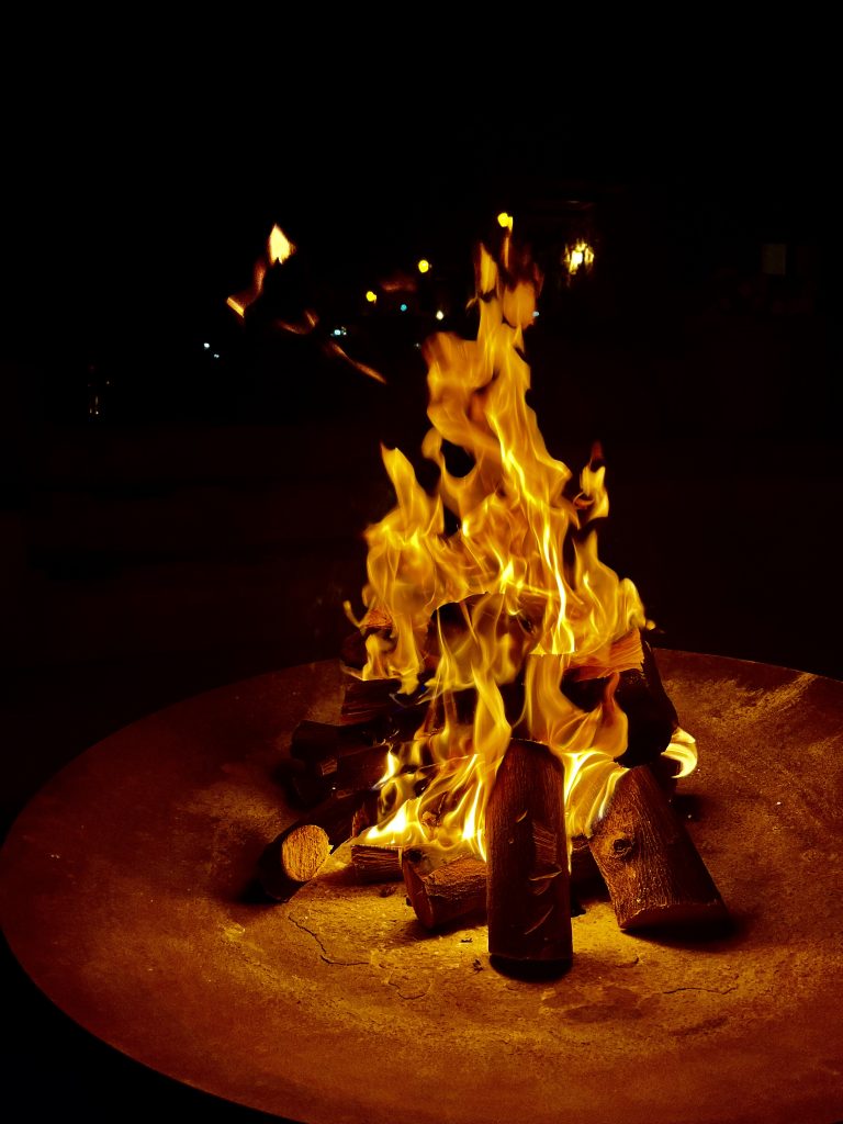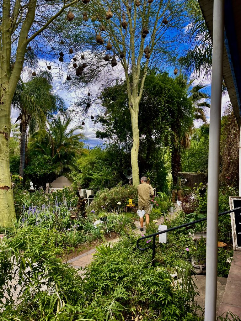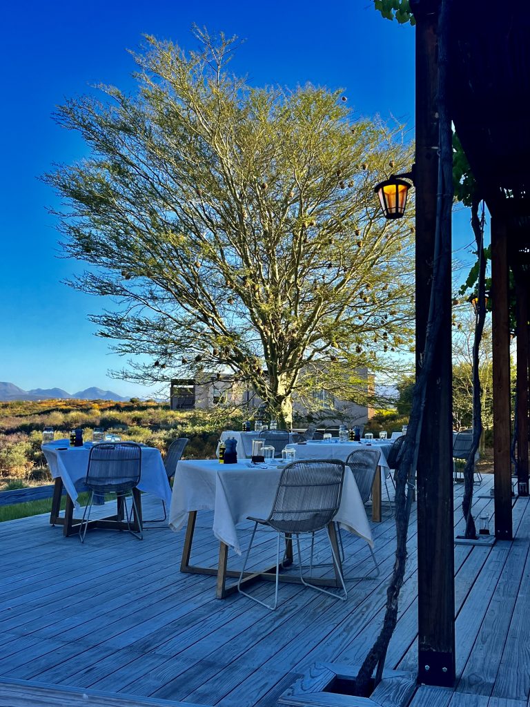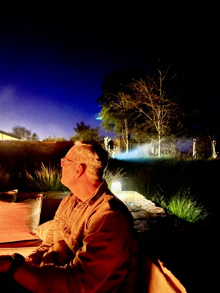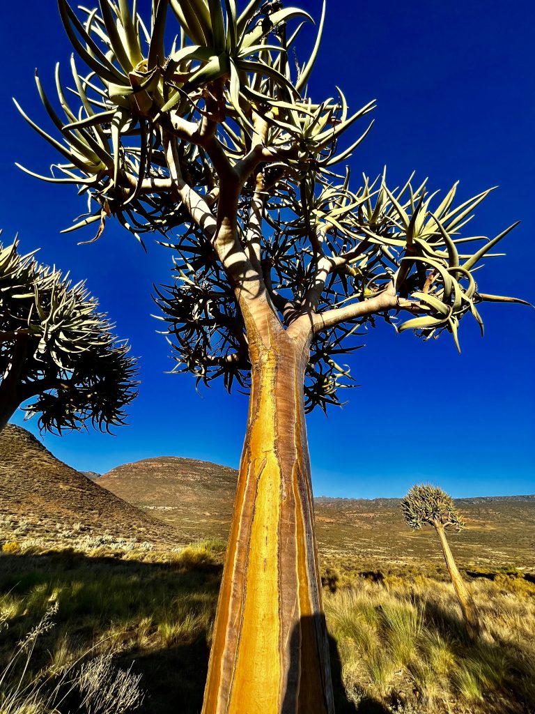 Beide bestellen wir ein ganzes Menü. Es werden kleine, feine Portionen sein. Nur eines irritiert uns sehr! Nirgendwo finden wir Preise. Auweia, das wird bestimmt teuer. Zumindest ist alles sehr lecker! Sterneküche eben. 😋 Apropos Sterne… Nach dem Dinner, wenn die Sonne vollständig untergegangen ist, wird vom Haus eine Sternenkunde angeboten. Wir dürfen als Outsider teilnehmen, kostenlos. 🤩 Aber was sind denn das nun für Bäume, die ich fotografiert habe? Erstmal hat keiner ne Ahnung. Es wird in der gesamten Belegschaft nachgefragt. Einer weiß es. Das sind Kokabooms, sie werden auch Quiver Trees / Köcherbäume genannt. Okay, dann weiß ich jetzt Bescheid. 👍 Bevor es zum Sternegucken geht, hat es noch Zeit, und wir nehmen mit unseren Getränken am Feuerplatz Platz, welches umgehend für uns entzündet wird.