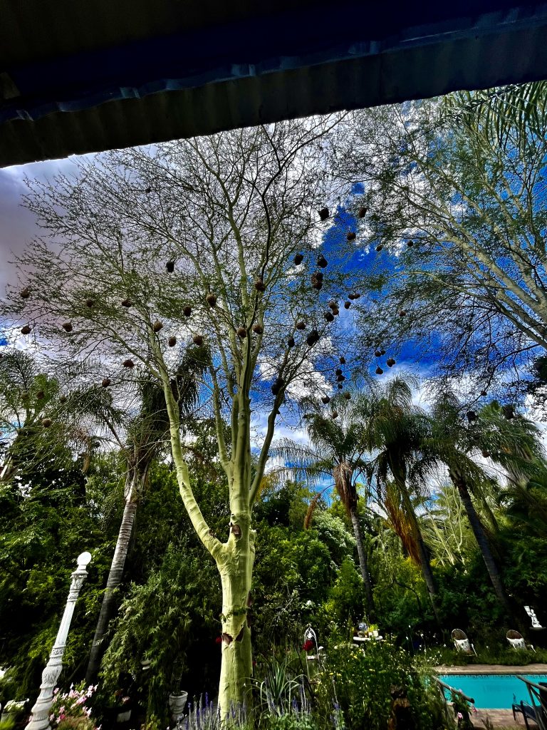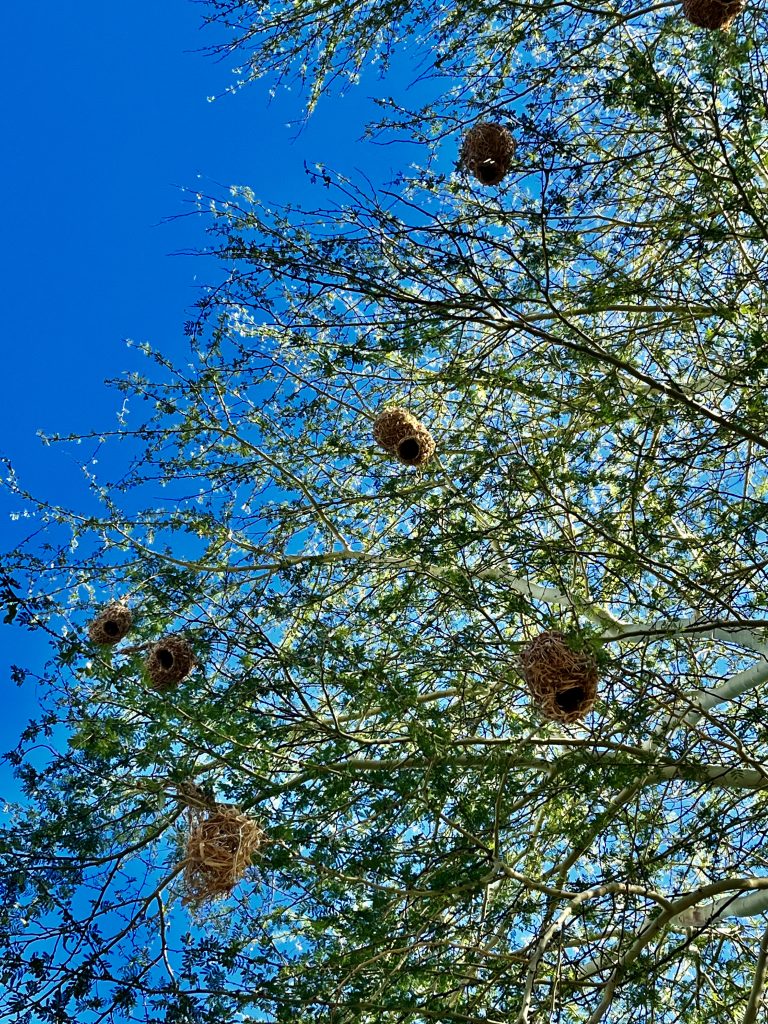 Im Hintergrund wieder ein Baum mit den beeindruckenden Nestern der Masken Weber.