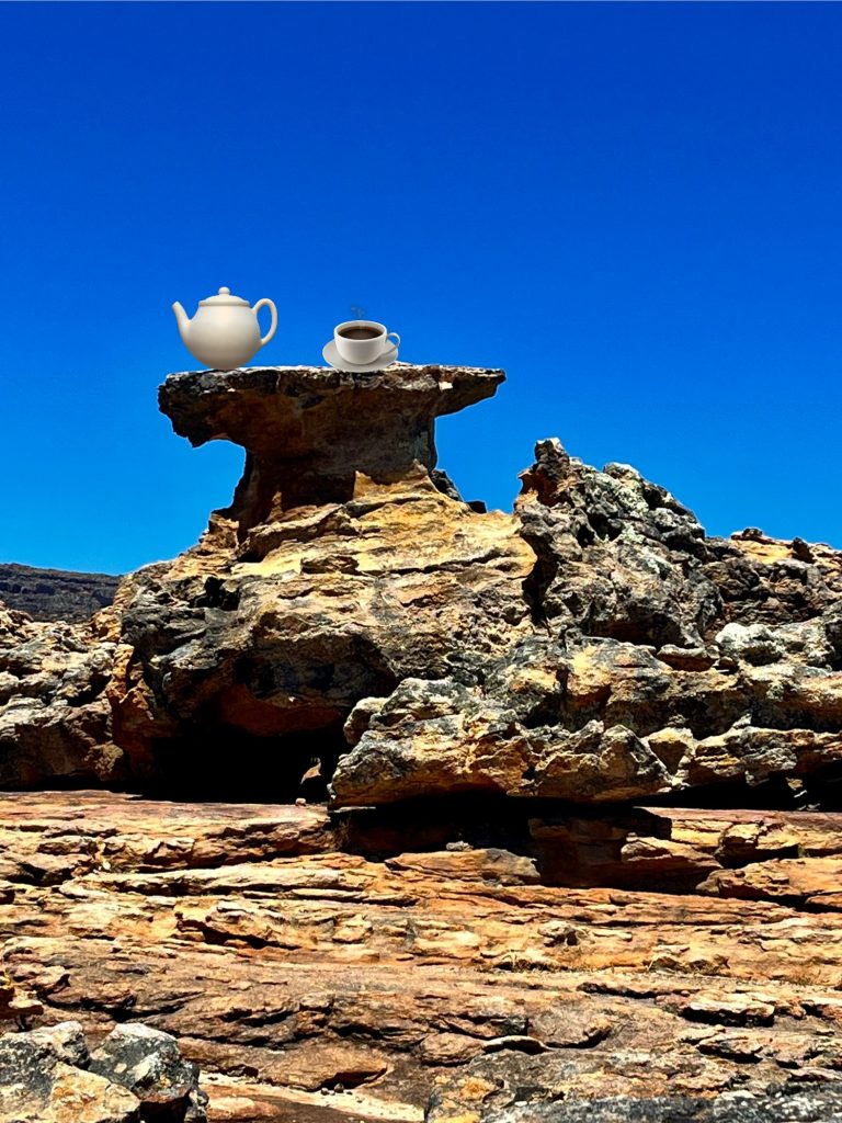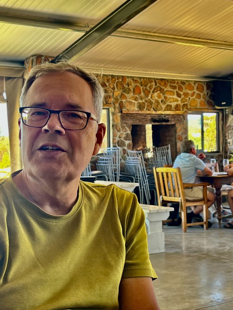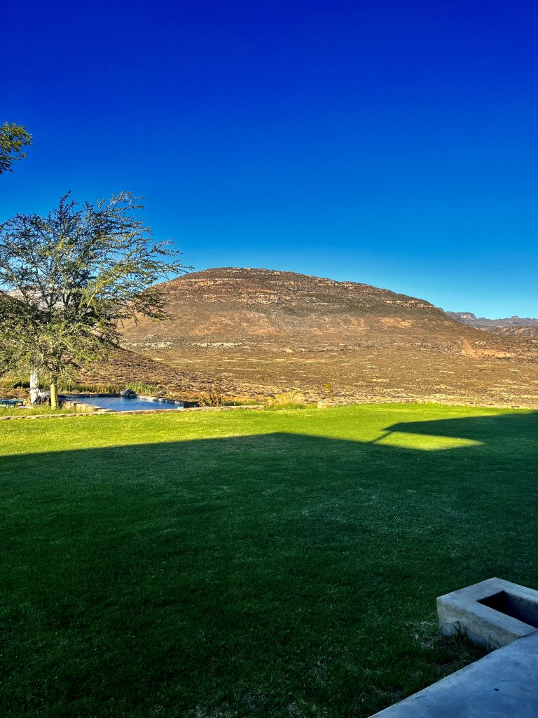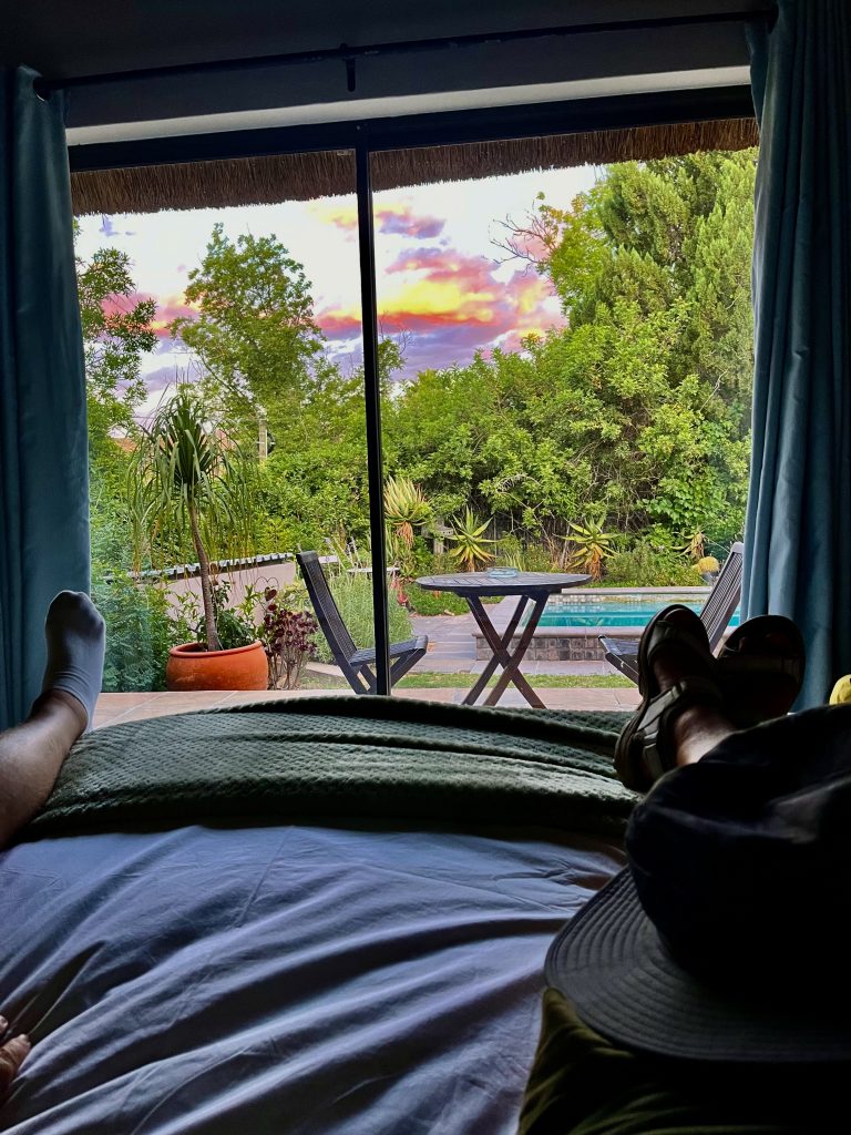 Nach 15 Minuten ist der Spuk zu Ende. Dann gehen wir, leicht durchfeuchtet, zum Sternegucken. Uns wird, von einem Einheimischen, sehr informativ der Sternenhimmel über Südafrika erklärt. Es ist ja alles etwas anders als unter europäischem Himmel! Dann erfahren wir noch etwas über den Roibuschtee-Anbau. Der Anbau gelingt nur und ausschließlich hier in Südafrika und nur in dem Gebiet um Clanwilliam, in den Cederbergen. Der braunrote Busch braucht sandigen Boden, heiße, trockene Sommer, kalte regenreiche Winter, mindestens 450 Höhenmeter und „koffie klips“. Das sind kaffeebohnenartige, rotbraune Steinchen. Je mehr, desto besser wird das Teearoma. Verarbeitet wird fast alles in Clanwilliam und 90 Prozent der Ernte wird exportiert. Mehr als die Hälfte geht nach Deutschland. So angefüllt mit neuem Wissen und fein gefüllten Mägen wagen wir uns jetzt mal an die Rezeption, um zu zahlen. 50,- Euro umgerechnet für uns beide zusammen, inclusive Trinkgeld, kostet uns dieser herrliche Abend. Das ist wenig! Ich glaube, die haben die Cocktails vergessen… 🤭. Glücklich und zufrieden fallen wir in unser weiches Bett.