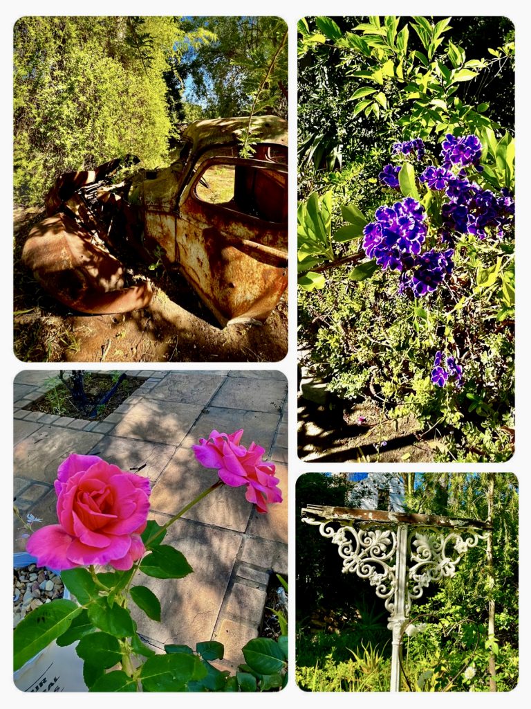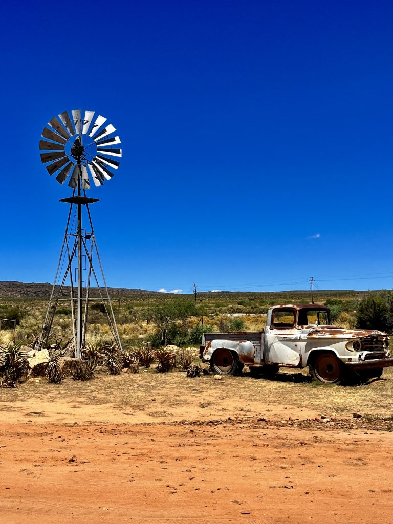 Wir sind da, bei Traveller’s Rest, und wie im alten Wilden Westen der USA, werden wir begrüßt von Windrad und altem Pick-up.