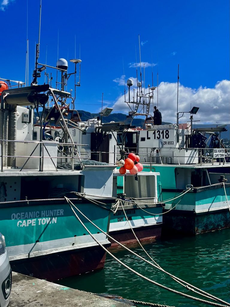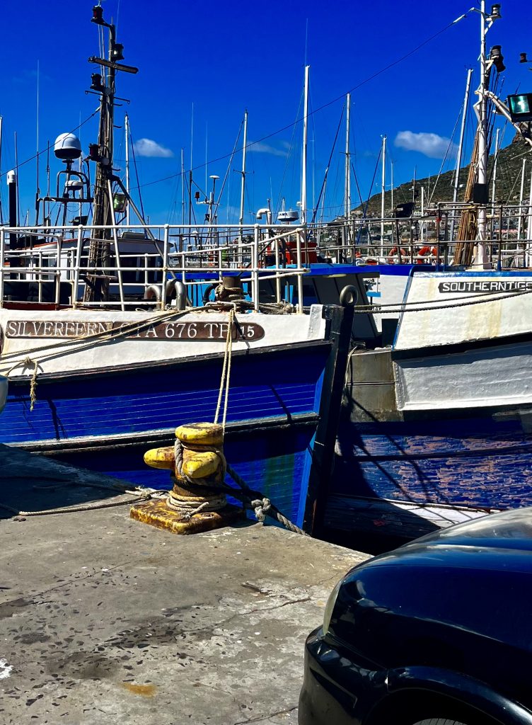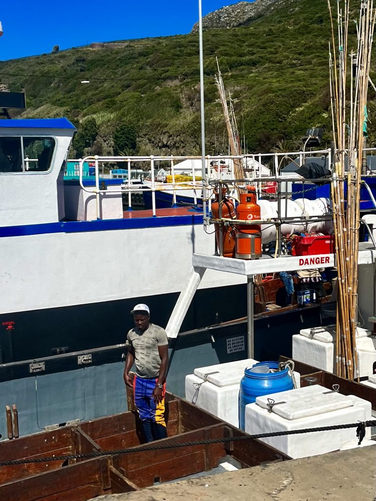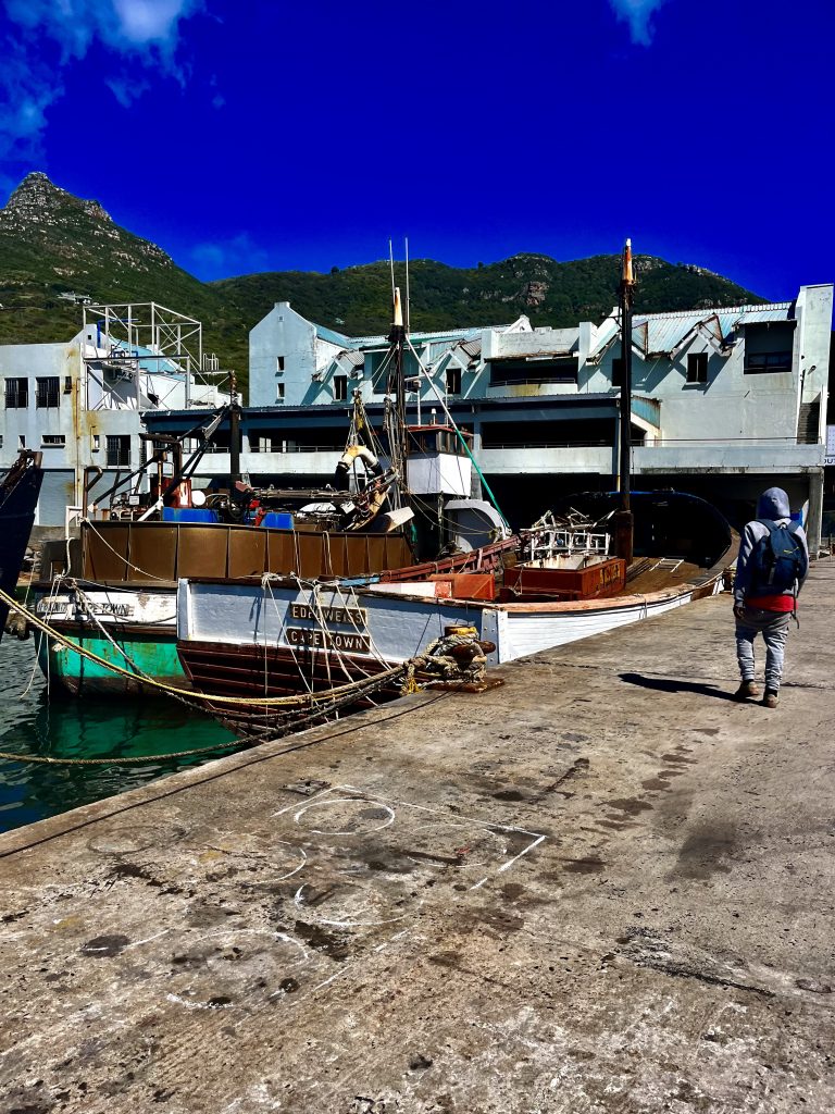 Dann sind wir da und staunen über den Trubel im Hafen von Hout Bay. Zig Fischerboote haben festgemacht, sind vom Fischfang auf hoher See zurück. Auch das gesunkene Schiff ist verschwunden und Fischkutter haben dort festgemacht.
